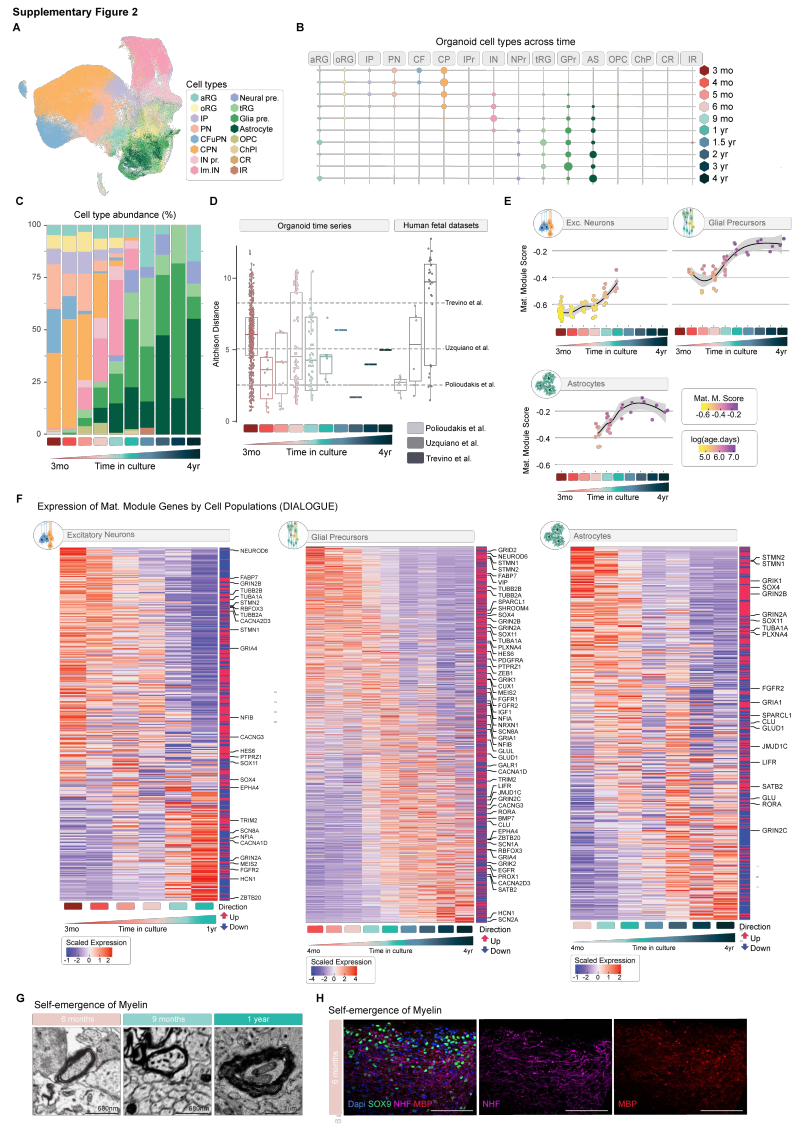 E、散点图展示各时间点(x轴)内每个类器官中所有星形胶质细胞、所有兴奋性神经元和所有胶质前体细胞的平均成熟度评分(y轴)。通过R语言geom_smooth()函数计算默认 95%置信区间(灰色区域)的平滑条件均值(黑线)。点为增强可视度添加了x轴轻微抖动,同一时间点内的水平位置不表示培养时长差异。