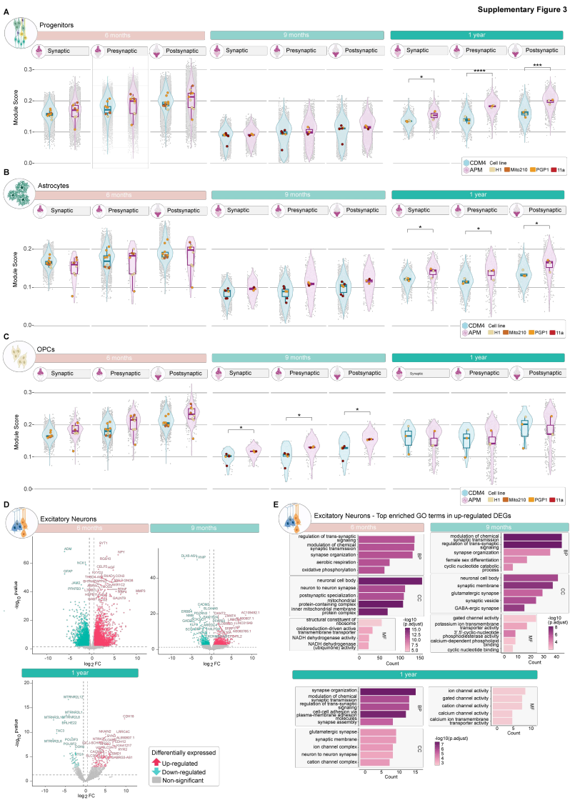 A-C、三个SynGO突触基因集在不同月龄(包括6月龄(CDM4:n=10个类器官;APM:n=9个类器官)、9月龄(CDM4:n=6个类器官;APM:n=3个类器官)和12月龄(CDM4:n=4个类器官;APM:n=3个类器官))经CDM4与APM处理的类器官其他细胞群体中的表达。小提琴图显示特定细胞群体中突触(GO:0045202)、突触前(GO:0098793)和突触后(GO:0098794)基因集的模块评分分布。单个类器官的平均模块评分以点状显示,并按遗传背景着色。箱形图的底边和顶边分别表示第25和第75百分位数,中线表示中位数,须线从铰链延伸1.5倍四分位距(IQR)。模块评分使用Seurat的AddModuleScore函数计算。各月龄经FDR校正的P值基于线性混合效应模型,星号标示CDM4与APM处理类器官各群体间显著差异:P<0.05(*);P<0.01(**);P<0.001(***);P<0.0001(****)(详见方法)。