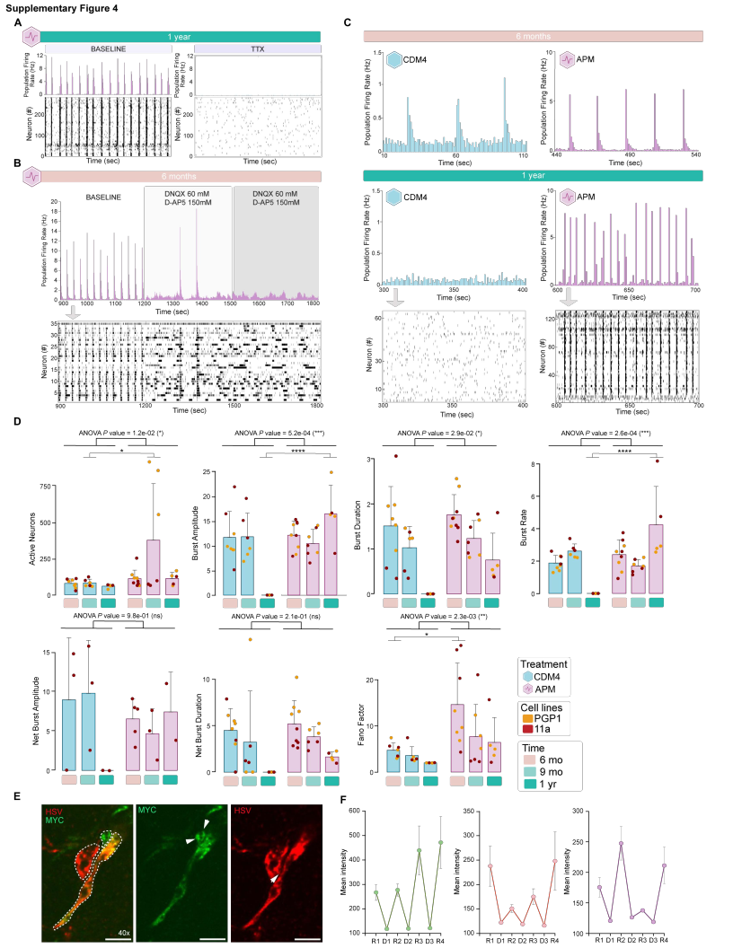 C、6月龄(上图)与12月龄(下图)类器官中部分单元的典型群体平均放电频率及点阵图,显示CDM4(左)与APM(右)组间差异。