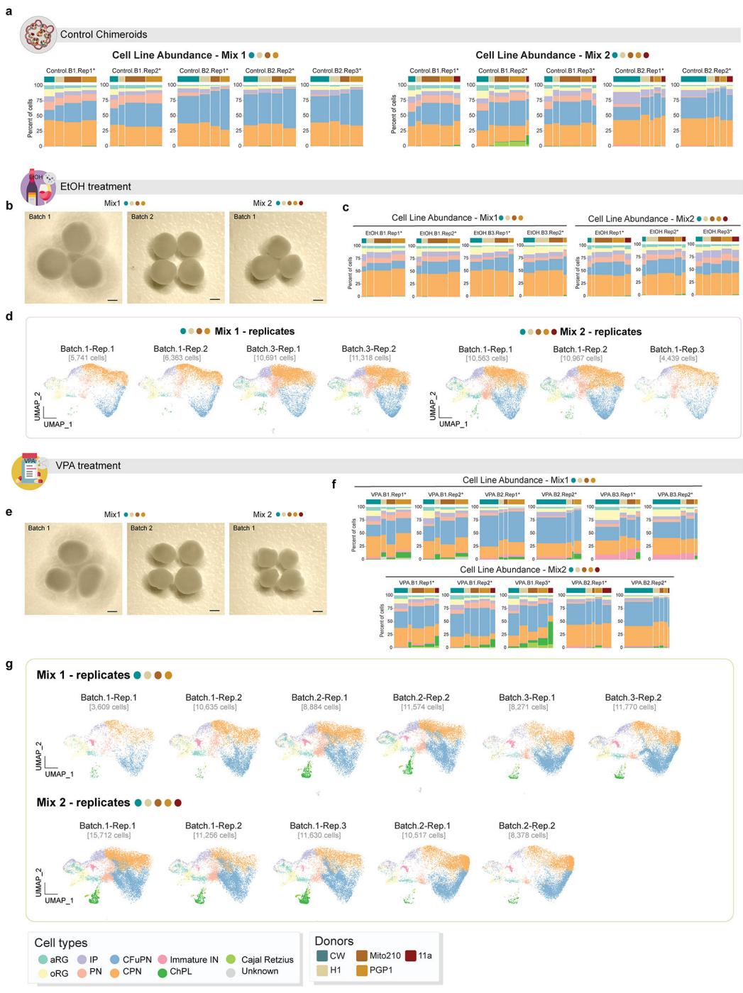 a、堆积条形图显示对照组Chimeroids的细胞类型和供体构成;每个条形宽度对应Mix 1(4名供体,左图)和Mix 2(5名供体,右图)中指定供体的比例。b、乙醇处理条件下培养3个月的整体皮质NSC-Chimeroids明场图像。比例尺:1毫米。c、堆积条形图显示乙醇处理组Chimeroids的细胞类型和供体构成;每个条形宽度对应Mix 1(4名供体,左图)中指定供体的比例,面板)和混合2(5名供体,右图)。d、按混合组和重复样本分列的乙醇处理NSC嵌合体UMAP图谱。e、VPA处理条件下培养3个月的完整皮质MD-NSC嵌合体明场图像。比例尺:1毫米。f、显示乙醇处理嵌合体细胞类型与供体组成的堆叠条形图;各条形宽度对应混合1(4名供体,上图)与混合2(5名供体,下图)中指定供体的占比。g、按混合组和重复样本分列的VPA处理NSC嵌合体UMAP图谱。