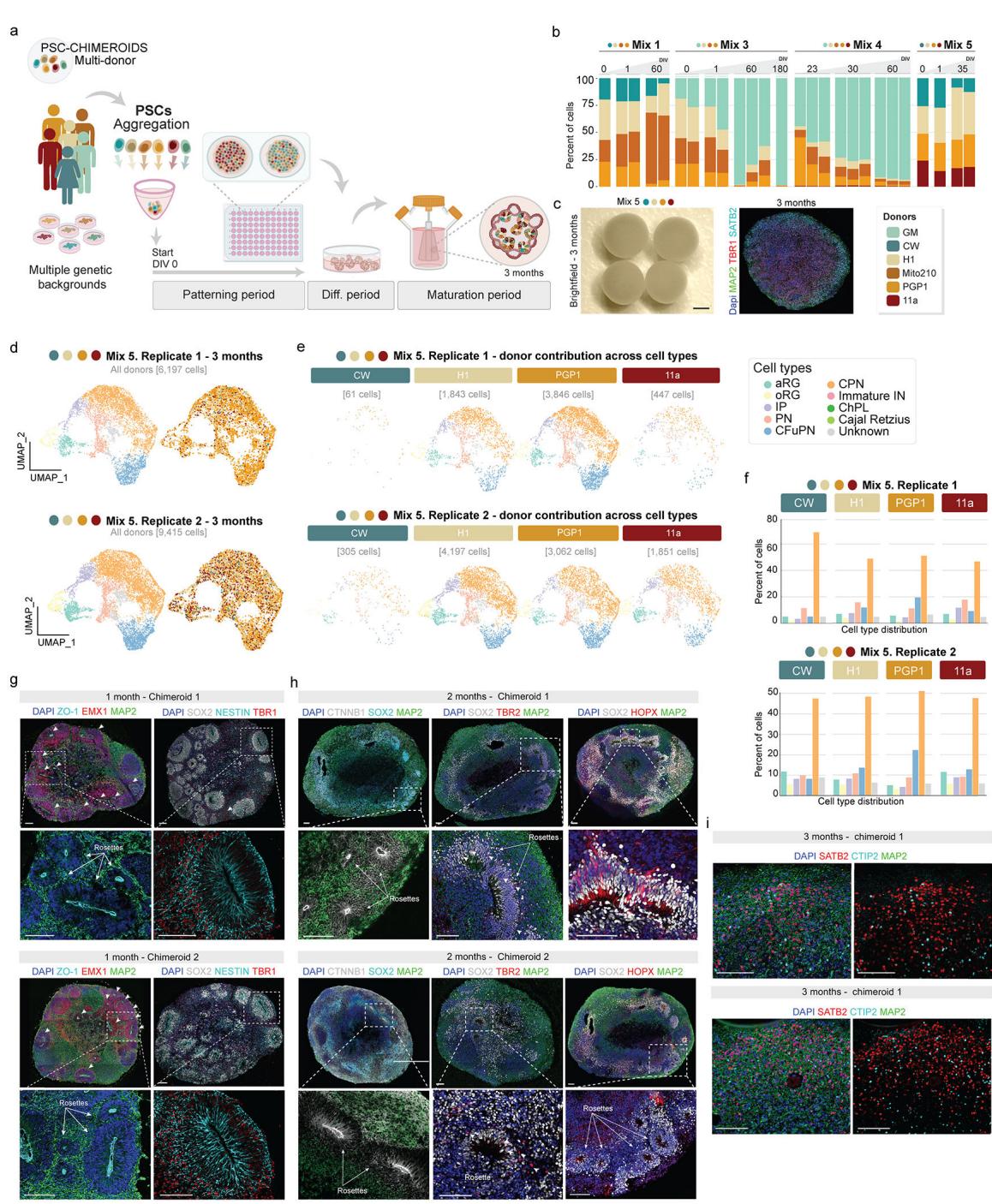a、PSC-Chimeroid方案示意图。b、显示供体组成的堆叠条形图,通过低通量全基因组测序的Census-seq方法测定,来自不同混合比例和时间点的PSC-Chimeroids,标记为自接种日起的天数(DIV0)。对于DIV0和DIV1时间点,n=4个Chimeroids已被合并分析。c、左图:3个月大PSC-Chimeroids的明场图像;比例尺:1毫米。右图:3个月PSC嵌合体中SATB2、TBR1和MAP2的免疫标记。比例尺:500μ米。d,3个月时整合PSC嵌合体的UMAP,按注释细胞类型(左图)和通过demuxlet确定的供体系(右图)着色。e,按供体分列的两次不同重复的UMAP。f,PSC嵌合体中细胞类型比例的条形图(n=2),按供体进行解复用。g,1个月PSC嵌合体的免疫标记显示早期祖细胞(SOX2)、皮质祖细胞(EMX1);玫瑰状中心以ZO-1(一种存在于放射状胶质细胞终足的紧密连接蛋白)和NESTIN为边界,表明神经上皮极化正确。CFuPNs神经元由TBR1标记,神经元树突由MAP2标记。h,2个月PSC嵌合体的免疫标记显示早期祖细胞(SOX2)、中间祖细胞(TBR2)和外放射状胶质细胞(HOPX)。CTNNB1标记神经玫瑰状中心,表明神经上皮极化正确。i,3个月PSC嵌合体的免疫标记显示皮质标记物,如SATB2(上层皮质神经元)和CTIP2(深层皮质神经元)。白色箭头指向神经玫瑰状结构(下图放大显示)。比例尺:100μ米。