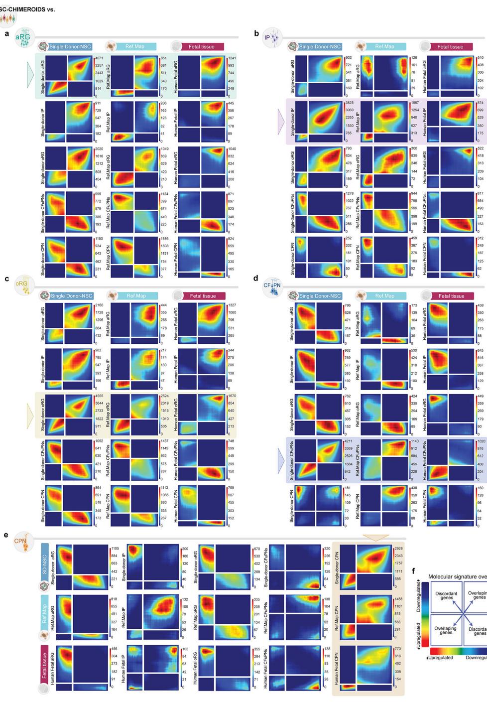等级-等级超几何重叠图(RR-HO)将多供体嵌合体中细胞类型的表达特征与以下数据进行对比:单供体嵌合体中的所有细胞类型、我们参考图谱中Velasco方案类器官发育的皮质类器官、或内源性人类胎儿组织²�。水平轴代表多供体神经干细胞嵌合体细胞类型相较于其他所有嵌合体细胞的标记基因列表,按从最显著上调至最显著下调的顺序排列;垂直轴则对应单供体神经干细胞嵌合体、参考图谱类器官或人类胎儿组织中类似排序的标记基因列表。胎儿细胞。特定位置的颜色表示截至该点的基因列表重叠的显著性(负对数p值),通过Fisher精确检验计算得出。左下和右上象限的高显著性(即红色)表明定义被比较细胞类型的表达谱之间存在高度一致性。a、b、c、d和e代表所分析的不同细胞类型。f、RR-HO图的解释性示意图。