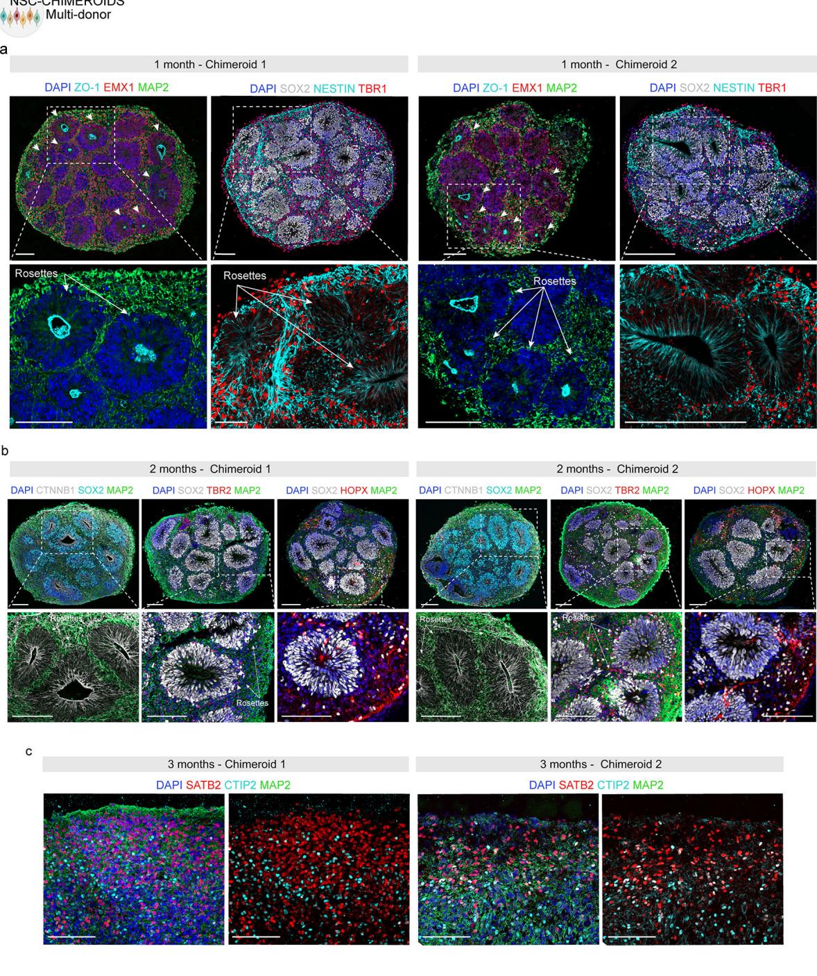 a、1个月MD-NSC嵌合体的免疫标记显示早期祖细胞(SOX2)和皮层祖细胞(EMX1);玫瑰结中心由紧密连接蛋白ZO-1包绕,该蛋白存在于放射状胶质细胞的终足,同时NESTIN信号表明神经上皮极性正确。CFuPNs神经元由TBR1标记,神经元树突由MAP2标记。b、2个月MD-NSC嵌合体的免疫标记显示早期祖细胞(SOX2)、中间祖细胞(TBR2)和外放射状胶质细胞(HOPX)。CTNNB1标记神经玫瑰结的中心结构。显示正确极化的神经上皮。c、3月龄MD-NSC嵌合体的免疫标记显示皮质标志物,如SATB2(上层皮质神经元)和CTIP2(深层皮质神经元)。白色箭头指向神经玫瑰花结。比例尺:100 μ微米。