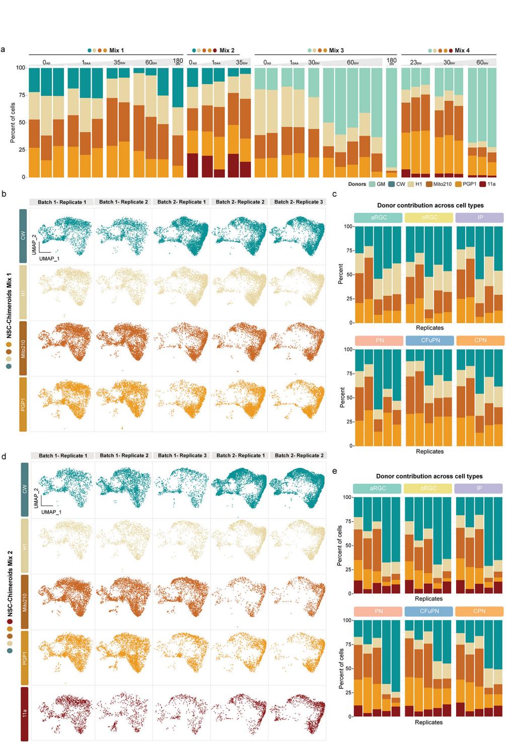 a、堆叠条形图显示了来自不同混合比例的多供体NSC-Chimeroid的供体组成情况,该数据通过低覆盖度全基因组测序中的Census-seq方法测得。并在不同时间点进行标记,即重聚后天数(DIV;针对DIV0和DIV1时间点,已汇总n=4个嵌合体)。b-e图分别为:按供体分列的3月龄NSC嵌合体UMAP图(b、d),以及混合1(4名供体)与混合2(5名供体)各细胞类型的供体贡献堆叠条形图(c、e)。