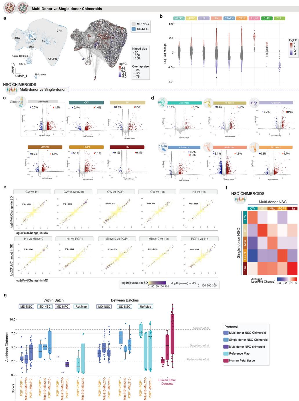 a、UMAP显示细胞重叠邻域,通过Milo计算得出。红色和蓝色表示来自单供体细胞显著富集的邻域。或多供体Chimeroid。点大小表示邻域内的细胞数量,边粗细表示成对邻域间共享的细胞数量。b、蜂群图显示细胞邻域组成的变化,按这些邻域细胞类型身份分组。每个点代表一个包含50-200个具有相似基因表达谱细胞的邻域。纵轴表示邻域内单供体细胞的富集程度,正对数倍变化值表示单供体细胞多于预期,负值表示少于预期。邻域着色基于该富集程度的统计学显著性:灰色表示与随机无显著差异;红色表示显著过度富集;蓝色表示显著低度富集。c-d、火山图分别显示MD与SD-NSC Chimeroid方案间整体及各供体(c)、各主要细胞类型(d)的差异表达基因。正log2倍变化表示在SD方案中表达更高。e、相关性散点图比较MD-NSC Chimeroid中每对供体间差异表达基因与SD-NSC Chimeroid中相同供体对间的差异。x轴和y轴分别显示MD和SD中的log2倍变化。点大小和颜色分别表示在MD和SD中的统计学显著性。f、热图显示MD-NSC Chimeroid方案中各供体(列)与SD-NSC Chimeroid方案中各供体(行)间log2倍变化的绝对值均值。数值越低表明越相似;每个供体的样本在另一方案中与同供体样本转录组相似度最高。g、Aitchison距离衡量各方案内重复样本间细胞类型组成的差异度,按批次内和批次间比较分组,且仅限源自PGP1和Mito210供体的细胞(因仅这两名供体存在于本研究所涉所有类器官/Chimeroid方案)。(n=23个PGP1、23个Mito210和10个胎儿样本;箱线图显示上下四分位数及中位数,须线显示最近铰链1.5倍四分位距内的最高/最低值)。三个胎儿皮质数据集内样本间的细胞类型组成差异亦展示于此,表明个体间自然变异。虚线代表各胎儿数据集内样本间平均距离20,22,23。