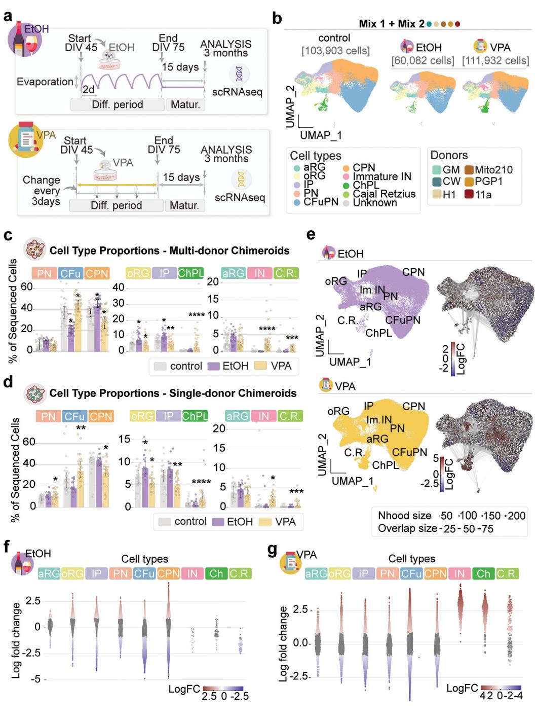 由于各细胞类型比例的变化具有相互依赖性(所有变化总和必须为零),我们采用了Milo21分析,结果证实VPA处理的MD-NSC嵌合体中未成熟IN细胞和ChPl细胞呈比例性增加而IPs细胞减少,同时乙醇处理的嵌合体中CFuPNs出现比例性下降(图4e-g)。此外,Milo在VPA处理的Chimeroid类器官中,oRG、CFuPN和CPN细胞群体凸显了表达谱的全局性改变,但离散细胞类型比例未发生整体变化;在EtOH处理的Chimeroid中,CPN细胞也呈现类似特征。VPA处理组17,824个细胞邻域中有6,327个(35.5%)发生显著改变,而EtOH处理组13,610个邻域中有5,589个(41.1%)发生变化(图4e-g)。值得注意的是,我们在SD-NSC Chimeroid模型中也观察到VPA处理对细胞类型比例的类似影响(图4d,扩展数据图13d,e)。