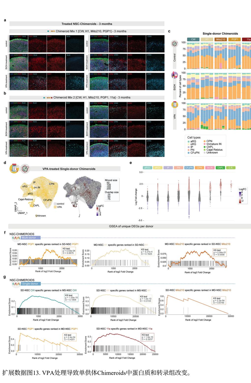 最后,我们在MD-NSC嵌合体中发现每个供体特有的VPA扰动基因(图5d);有趣的是,受影响程度越强的供体具有更高比例的供体特异性VPA扰动基因。重要的是,在VPA暴露后,相应的SD-NSC嵌合体中也富集了这组相同的独特基因(图5e、扩展数据图13f、g及补充表8)。