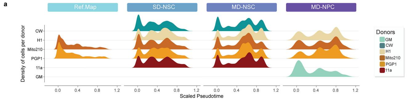 对每个数据集分别计算伪时间,包括3月MD NSC-Chimeroids、3月SD NSC-Chimeroids、3月NPC-Chimeroids以及3月参考图谱类器官(仅包含源自PGP1或Mito210细胞系的3月类器官子集),使用Monocle3(v 1.3.4)进行R语言分析并以aRGs作为根细胞。针对每个数据集,将伪时间值缩放至最小值为0、最大值为1。通过ggplot2的geomdensity_ridges函数可视化各数据集中不同细胞类型和供体在伪时间轴上的分布密度。