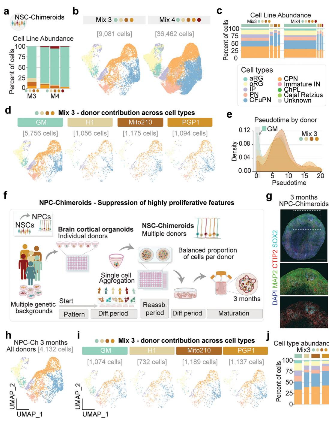 显示SOX2、CTIP2和MAP2染色的3月龄NPC-Chimeroids。比例尺:500 μm。h-i. 整合后(h)及按供体拆分(i)的NPC-Chimeroids UMAP可视化(展示各数据集总细胞数)。j. 细胞类型与供体组成的条形图。
