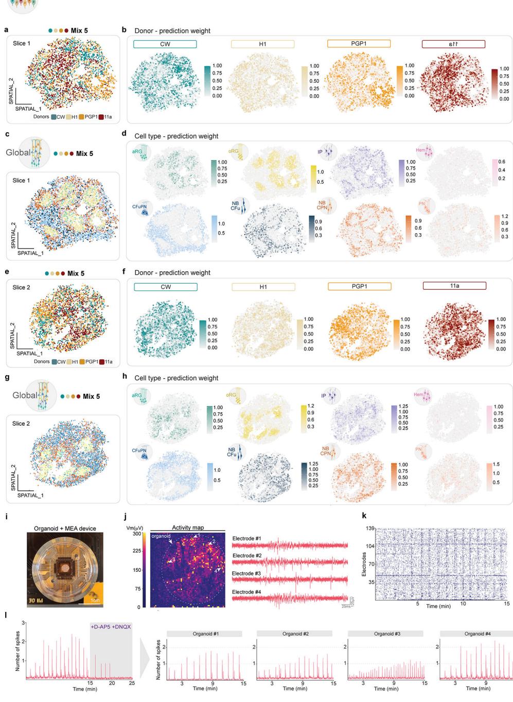 a,切片#1。来自2月龄MD-NSC嵌合体(混合5)的Slide-seq数据空间分布图,通过Census-seq方法以最大供体贡献值进行色彩标注。b,展示供体预测结果的空间分布图权重。c,来自2月龄NSC-Chimeroids(混合5)的Slide-seq数据空间分布图,按RCTD分配的细胞类型着色。d,展示细胞类型预测权重的空间分布图。e,切片#2。同图a。f,切片#2。同图b。g,Slide#2。同图c。h,Slide#2。同图d。i,放置于多电极阵列(MEA)上的代表性类器官。j,4月龄MD-NSC Chimeroid网络爆发的代表性活动图谱,其中图谱每个像素代表一个电极(左图),活动图谱中高亮电极的动作电位示例轨迹(右图)。k,显示活跃电极(139个,定义为类器官轮廓内平均放电频率>0.15次/秒的电极)在15分钟记录期间放电活动的代表性点阵图。网络爆发约在5分钟左右开始出现。l,AMPA和NMDA阻断剂(D-AP5, 150μM; DNQX 60μM)对神经元活动/网络爆发的影响(左图);4个记录的NSC-Chimeroids网络爆发活动(右图)。
