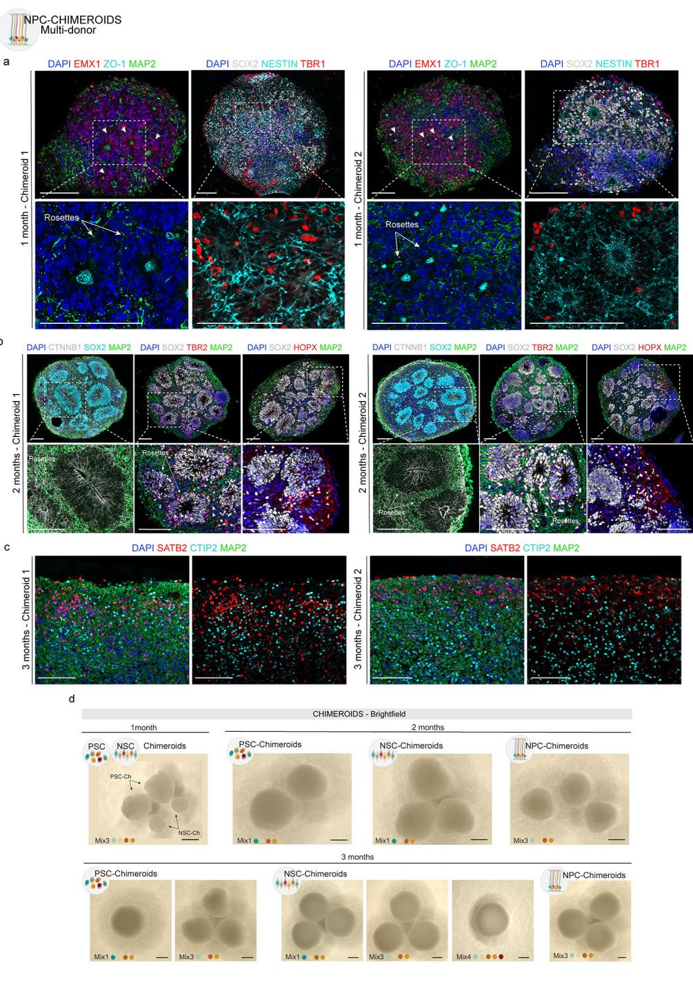a、1月龄NPC-Chimeroids的免疫标记显示早期祖细胞(SOX2)、皮质祖细胞(EMX1);玫瑰状结构中心由ZO-1(一种存在于放射状胶质细胞足端的紧密连接蛋白)勾勒轮廓,NESTIN信号表明神经上皮极性正确。CFuPN神经元通过TBR1标识,神经元树突通过MAP2标记。b、2月龄NPC-Chimeroids的免疫标记显示早期祖细胞(SOX2)、中间祖细胞(TBR2)和外放射状胶质细胞(HOPX)。CTNNB1标记神经玫瑰状结构中心,表明神经上皮极性正确。c、3月龄NPC-Chimeroids的免疫标记显示皮质标记物如SATB2(上层皮质神经元)和CTIP2(深层皮质神经元)。白色箭头指向神经玫瑰花结。比例尺:100 μm。d,所有方案中3个月Chimeroids的明场图像(比例尺:1 mm)。