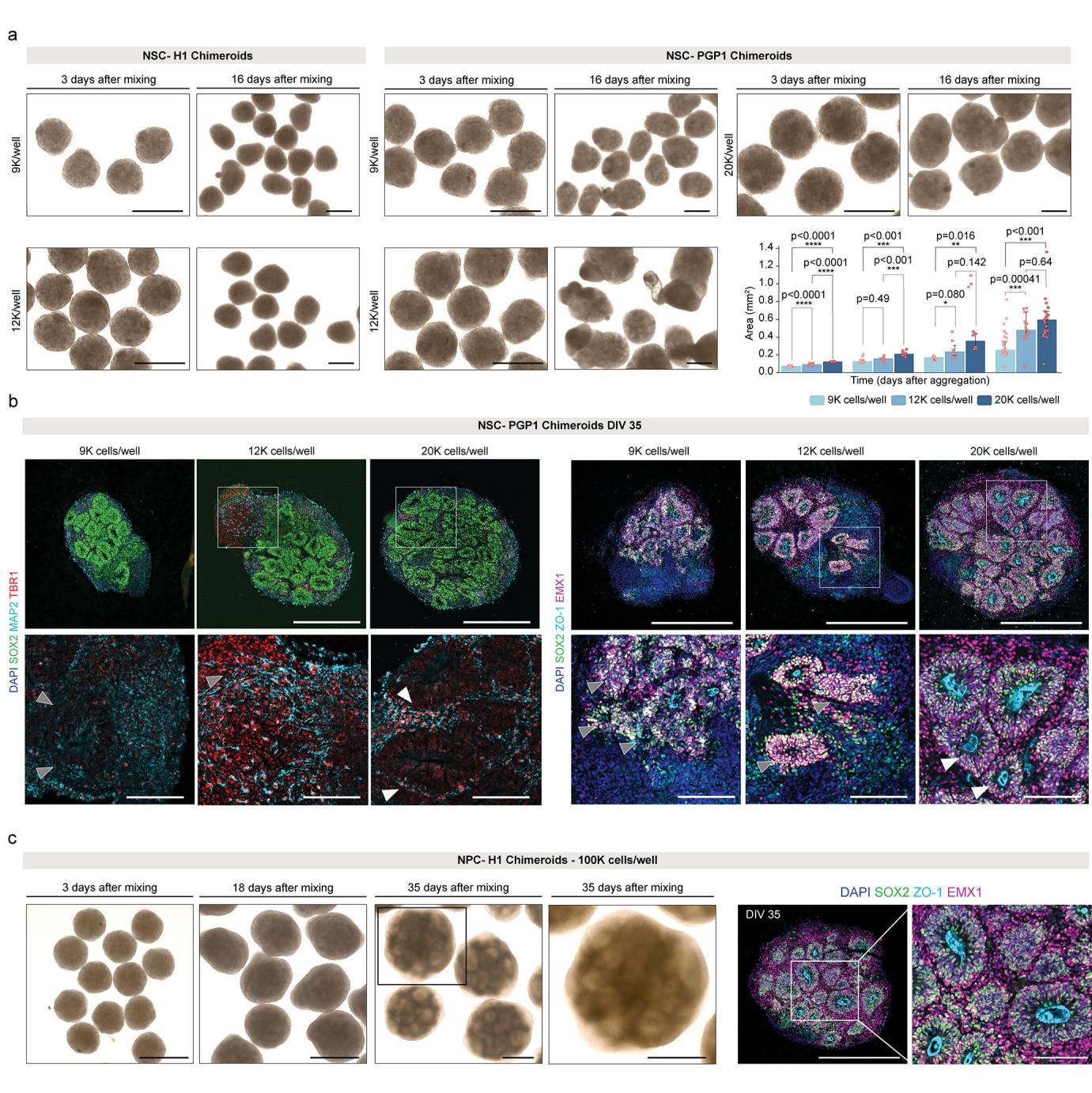 a. 单供体H1 NSC-Chimeroids在重聚集后第3天和第16天(左图)分别以9,000(上排)和12,000(下排)细胞/孔接种的明场图像;单供体PGP1 NSC-Chimeroids在重聚集后第3天和第16天(右图)分别以9,000(左上)、12,000(左下)和20,000(右上)细胞/孔接种的明场图像。比例尺:500μm。右下方的柱状图显示PGP1 NSC-Chimeroids在不同聚集细胞数条件下的随时间生长情况。柱体表示中位数,须线表示上下四分位数(所有4个时间点共n=170个Chimeroids)。显著性通过方差分析及双侧检验计算得出。Tukey事后成对检验。P值:*** < - 0.001;**** - <0.0001。b. PGP1单供体NSC嵌合体的免疫标记,通过聚集指定数量的细胞制成,在DIV35时。上图显示整个类器官;下图显示指定部分的放大。左图,SOX2(祖细胞)、MAP2(神经元树突)和TBR1(深层神经元)的免疫标记。右图,SOX2、ZO-1(紧密间隙连接)和EMX1(背侧皮质祖细胞)的免疫标记。比例尺:500 μ微米(上图)和125 μ微米(下图)。箭头指示非皮质(灰色)和皮质(白色)区域。c. 左图:H1单供体NPC嵌合体的整个类器官明场图像,在聚集时接种100,000个细胞,混合后18天和35天。比例尺:500 μ微米。右图:H1单供体NPC嵌合体的免疫标记,显示SOX2、ZO-1和EMX1。比例尺:500 μ微米和125 μ微米(放大)。