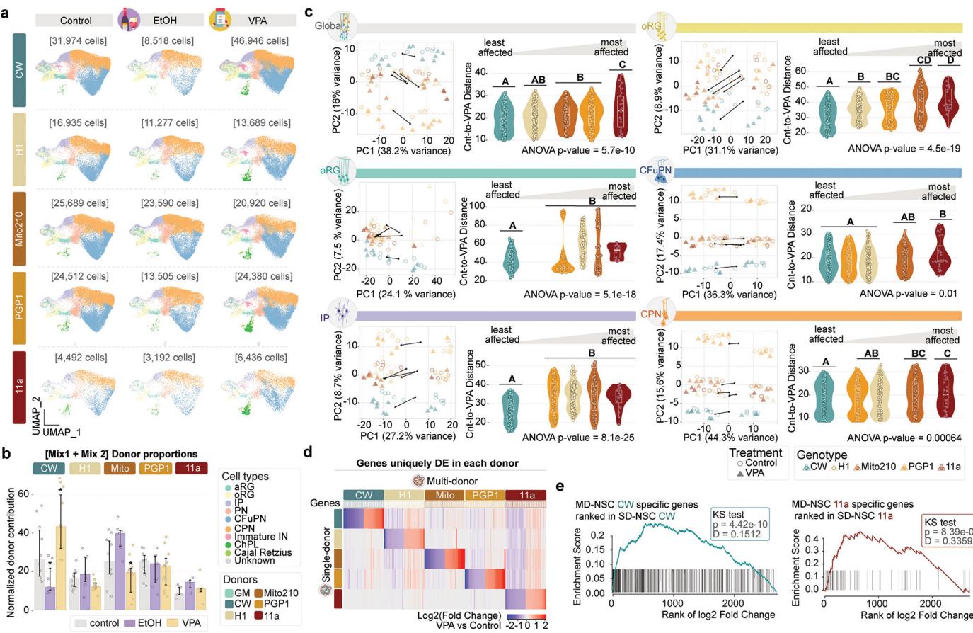 图5. NSC嵌合体揭示供体特异性易感差异。a、按供体拆分并经细胞类型着色的对照组、EtOH处理组和VPA处理组嵌合体UMAP图谱。b、对照组NSC嵌合体(灰色,n=10次重复)及EtOH(n=7次)或VPA(n=11次)处理后的标准化供体比例条形图。Y轴表示每个嵌合体中测量的供体丰度与混合样本中所有供体均等表达时的预期丰度之比。实心条:中位数;误差条:上下四分位数。显著性检验:对每个供体的细胞计数应用负二项广义混合效应模型进行单侧F检验。FDR校正p值:* - <0.1;** - <0.01;*** - <0.001(参见方法)。c、对VPA处理组(三角形)和未处理组(圆形)NSC嵌合体各细胞簇基因表达矩阵进行主成分分析,按供体(颜色标示)和重复样本进行伪批量处理,分析涵盖所有细胞(左上,n=94)及按细胞类型细分样本(oRG、aRG、CFuPN、IP和CPN分别对应n=85、70、94、88、94)。对应右侧面板:小提琴图展示各供体经处理与未处理伪批量数据点在PCA空间中的成对欧氏距离。箱线:中位数及上下四分位数;须线:最近铰链1.5倍四分位距内的最高/最低值。距离越大表明VPA处理引发的表达谱变化越显著。显著性检验:方差分析(ANOVA)及后续双尾Tukey事后配对检验。d、VPA处理MD-NSC嵌合体中供体特异性差异表达基因热图。e, 供体特异性差异表达VPA处理MD-NSC嵌合体的基因集富集分析(GSEA),基于对应的SD-NSC数据集排序。P值通过双侧柯尔莫哥洛夫-斯米尔诺夫检验计算。