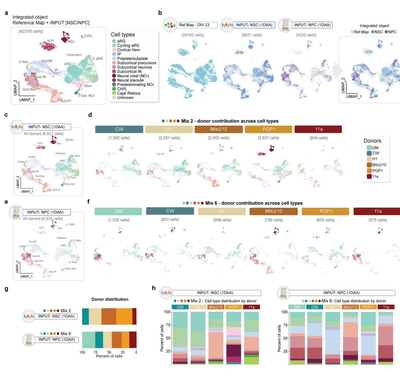 a, 整合数据集的 UMAP,包含来自我们 Velasco 协议类器官发育参考图谱(“参考图谱”)的 DIV23 类器官,以及聚集后 1 天的 MD-NSC 和 MD-NPC 嵌合体(输入),按注释的细胞类型进行颜色编码。�b. 按协议分割的 UMAPs。�c, MD-NSC 嵌合体(混合 2)输入的 UMAP,按注释的细胞类型进行颜色编码。�d, 按供体分割的 UMAPs。�e,MD-NPC 嵌合体(混合 6)输入的 UMAP,按注释的细胞类型进行颜色编码。�f, 按供体分割的 UMAPs。�g, 供体经过单细胞RNA测序后进行解复用。h、各供体INPUT MD-NSC与MD-NPC嵌合体中细胞类型比例的条形图。
