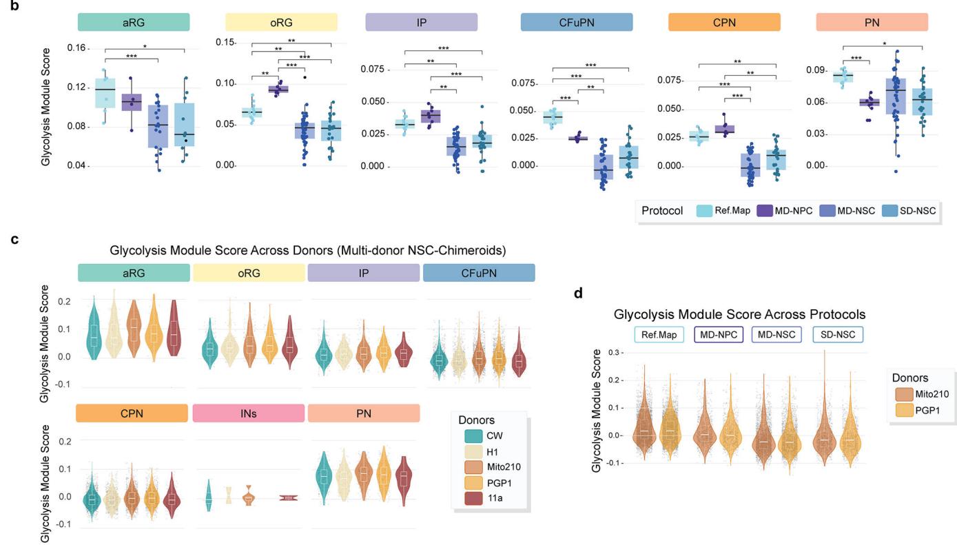 采用MSigDB Hallmark基因集中的糖酵解基因集(包含200个基因),通过Seurat的AddModuleScore函数对以下数据集中的20,000个细胞随机子集进行模块评分计算:3月MD NSC-Chimeroids、SD NSC-Chimeroids、NPC-Chimeroids以及参考图谱类器官样本(仅包含源自PGP1或Mito210细胞系的3月类器官)。为验证不同类器官与Chimeroids方案在各主要细胞类型(aRG、oRG、IP、PN、CFuPN、CPN和IN)中是否呈现差异化的糖酵解表达模式,分别对参考图谱类器官中各细胞类型的全部细胞、以及Chimeroids中每位供体的各细胞类型细胞计算糖酵解模块评分均值。针对每种细胞类型,使用以起源供体作为随机效应的混合线性模型,进行数据集间两两比较,并通过R语言基础anova函数比较包含与不包含“方案”作为协变量的模型。