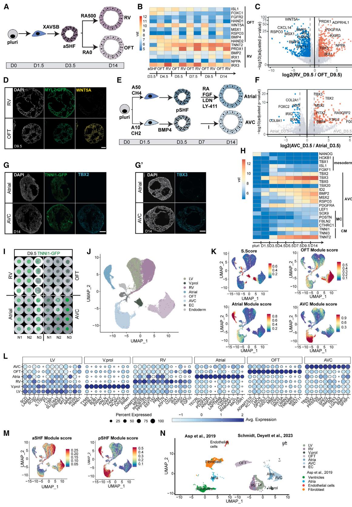 (J–N)不同分化方案的单细胞RNA测序(scRNA-seq)对比分析(;心房类器官:,技术重复数 ):