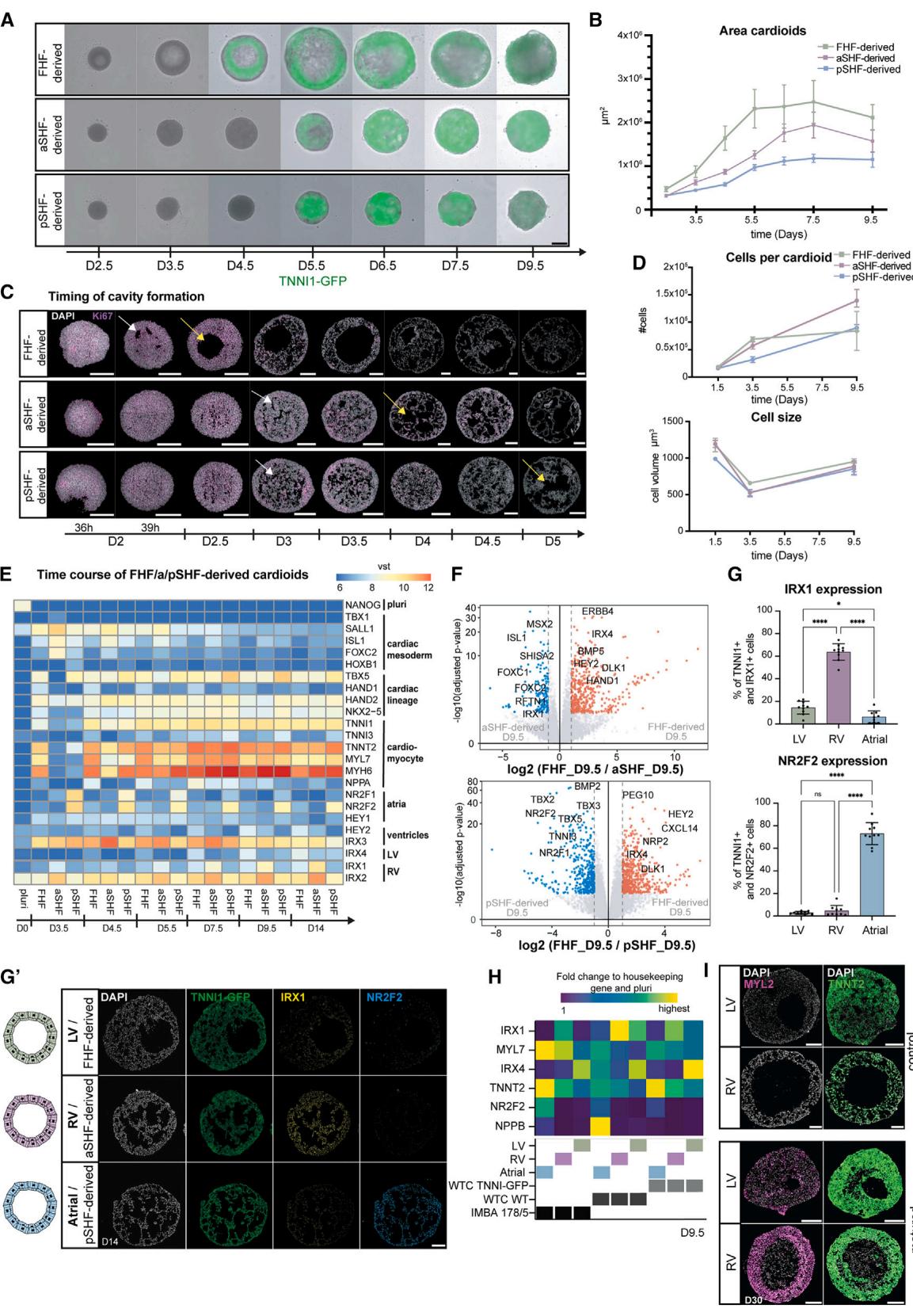 图2. aSHF/pSHF来源的心腔体呈现类体内形态发生延迟及基因表达特征 (A) TNNI1-GFP-hPSC来源心腔体亚型的时序代表性整体标本图像。比例尺为500毫米。 (B) 对应(A)图中分化过程心腔体面积变化的量化分析(每个时间点N , 96)。### (C)心脏类器官冰冻切片的Ki67免疫染色结果