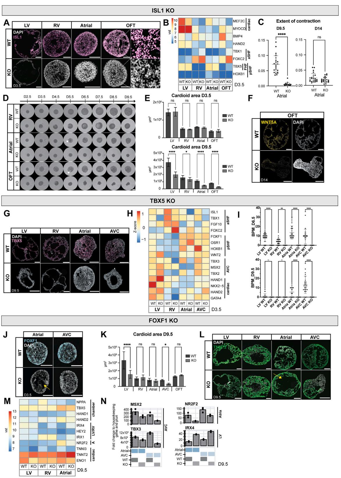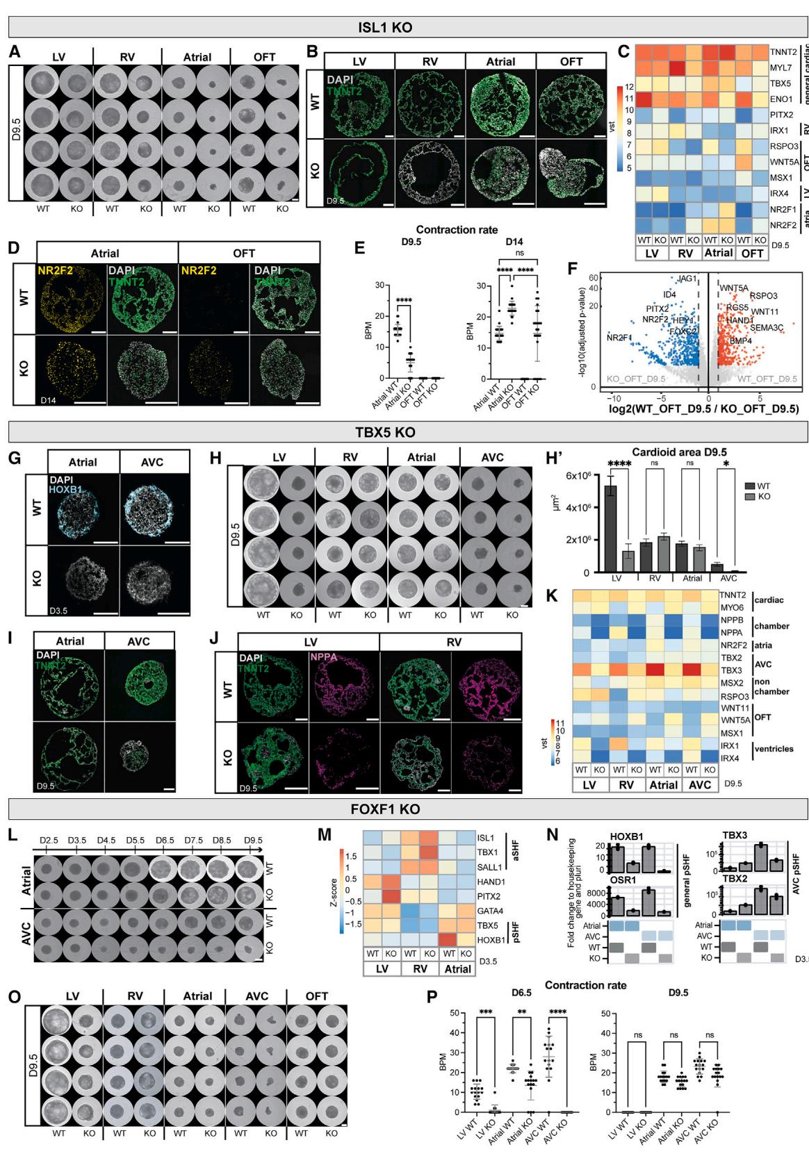 (G) 通过免疫染色验证第9.5天左心室(LV)、右心室(RV)、心房及房室瓣(AVC)类心脏体中TBX5基因敲除(KO)细胞系的有效性。