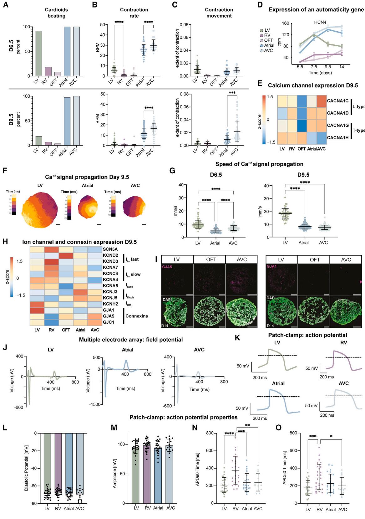 在心脏发育早期,离子通道表达相对均匀,但到后期阶段会出现心室特异性基因表达谱和物种特异性动作电位形态——这些通常通过场电位或AP时程进行测量。33 到第9.5天时,类心脏器官亚型也形成了独特的离子通道表达模式(图4H)。由于表征早期人类心肌细胞亚型在3D类心脏器官、类器官衍生的2D单层细胞以及单颗2D心肌细胞中FP与AP的差异至关重要,我们采用了多电极阵列、电压敏感染料成像和手动膜片钳技术。将完整类心脏器官置于 电极网格上,以高空间分辨率测量FP。我们观察到不同类心脏器官亚型间的FP多样性(图4J和图S4H–S4L),其中单个左心室类心脏器官表现出比A/AVC类心脏器官更均匀的信号传播FP分布(图S4I–S4L)。在2D单层细胞中使用FluoVolt染料时,发现LV/RV心肌细胞的APD长于心房心肌细胞(图S4M–S4P)。单细胞膜片钳分析显示心房/AVC的APD短于RV心肌细胞,这证实了单层细胞的趋势,且与人类原代心肌细胞数据一致(图4K、4N、4O、S4Q–S4U)。舒张电位约为 (图4L),AP的上冲速度(图S4S)和振幅(图4M)与最先进的体外模型相似34,重要的是特定心肌细胞在电生理上呈现均质性。综上所述,类心脏器官亚型的电化学信号具有多样性且呈现胎儿样特征,为研究早期人类心脏发生的功能机制提供了平台。