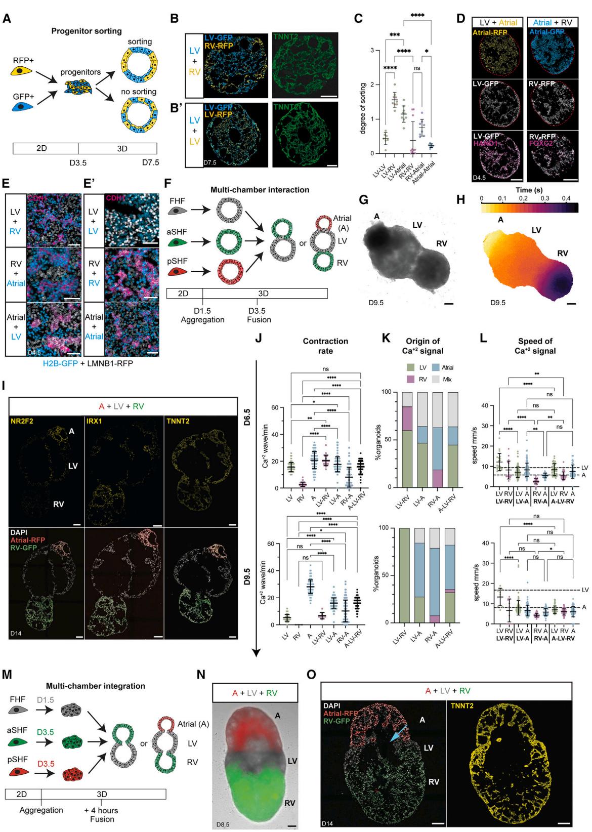 人类胎儿死亡的首要原因是心脏发育缺陷。由于人类胚胎心脏难以直接研究,且突变、药物及环境因素对不同心腔特异功能的影响无法通过体外模型完整呈现,追溯根本病因十分困难。本研究建立了可重现所有主要胚胎心腔发育过程的人源心源性类器官平台,涵盖左右心室、心房、流出道及房室管。通过结合二维与三维分化技术,我们高效培育出具有不同第一心场、前部及后部第二心场特征的祖细胞亚群。这一突破实现了具备腔室特异性体内样基因表达谱、形态结构与功能的心源性类器官的可重复生成。利用该平台,我们揭示了相互作用心腔间信号传导与收缩传播的个体发育规律,并解析了突变、致畸剂及药物如何导致发育中人类心脏出现腔室特异性缺陷。
