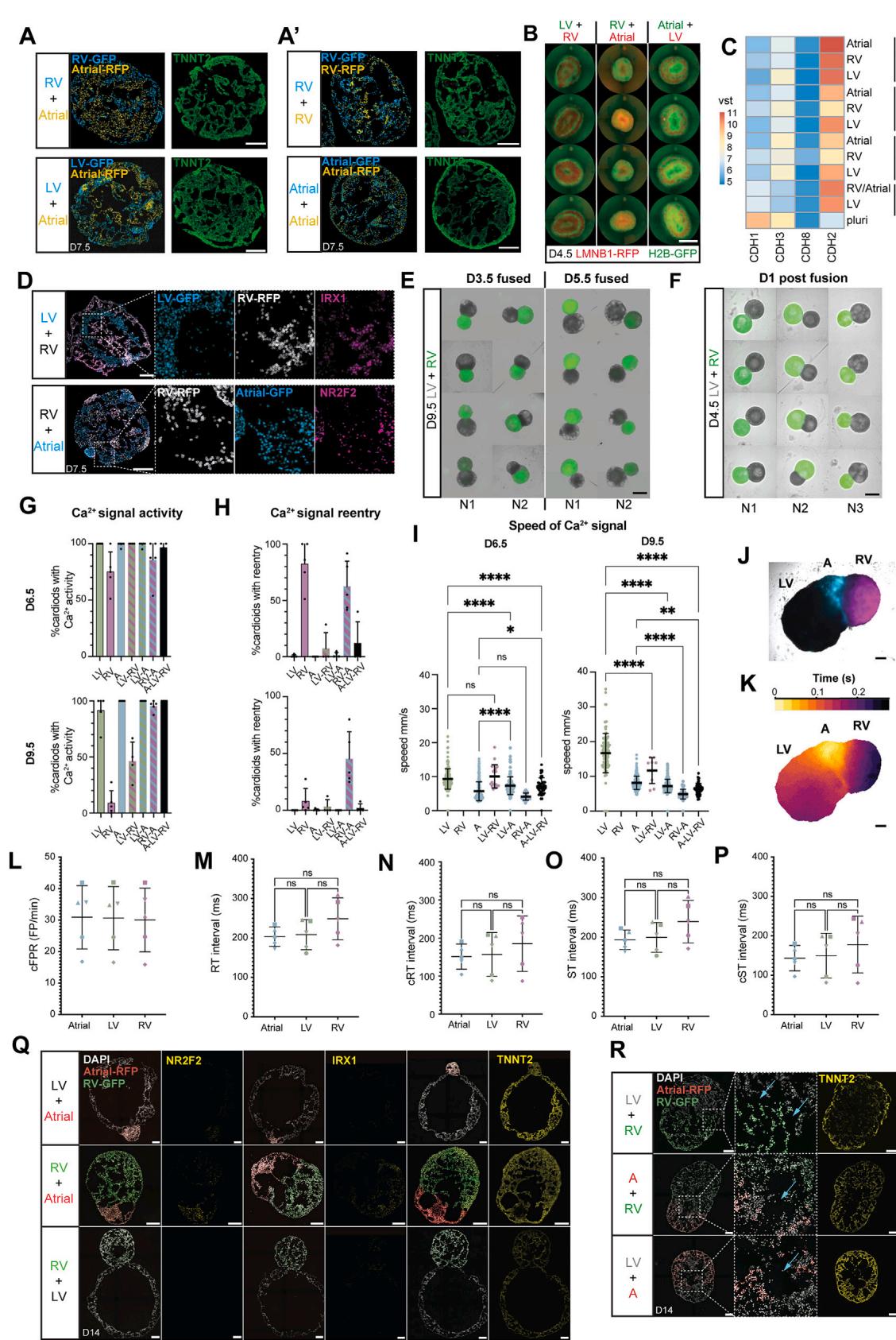 (D) 不同祖细胞群混合形成的类心脏体横截面,右心室(RV)特异性标志物(IRX1)与心房特异性标志物(NR2F2)的染色结果。