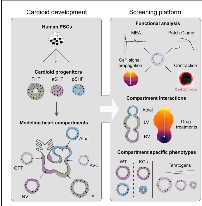 在此,我们建立了一个多腔室类心脏平台,该平台揭示了相互作用的心腔如何协调收缩,以及基因突变、药物和环境因素如何影响发育中人类心脏的特定区域。