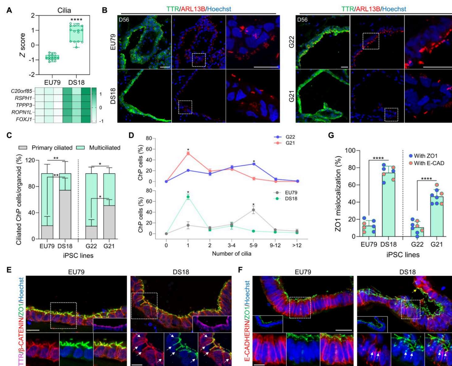 唐氏综合征由21号染色体三体引起,导致发育迟缓和智力缺陷(47)。人类发育中的DS大脑和Ts65Dn DS小鼠模型均进一步显示出少突胶质细胞分化和髓鞘形成缺陷(18)。此外,21三体成纤维细胞表现出纤毛形成和功能减少(20),使得DS大脑成为在ChPCO中建模的特别有趣的病理模型。因此,我们利用源自DS患者(DS18)的iPSC系及其同基因二倍体对照iPSC系(EU79)生成了ChPCO类器官(48)(图6A)。DS ChPCO类器官的尺寸与二倍体类器官相当(图S5A),表明两者具有相似的生长速率。对EU79和DS18细胞系生成的至少三批不同ChPCO类器官中脉络丛样上皮和皮质组织细胞群比例的量化显示,二倍体和DS系的ChPCO均能稳定形成脉络丛样上皮和皮质组织区域,且不同批次间细胞比例相似(图6B和C)。为更详细表征同基因DS与二倍体ChPCO,我们在第28天对类器官进行RNA-seq分析(每个重复三个类器官)(图6D、图S5B和表S1)。分析显示二倍体与DS类器官呈现差异转录谱(图S5B),与同基因二倍体类器官相比,DS类器官中有962个基因表达上调,997个基因表达下调(图6D和表S1)。位于HSA21上的22个基因位列差异表达基因前500位(图S5D),其中四个基因(MX2、TMPRSS2、ADAMTS5和RUNX1)与病毒感染相关(图S5D)。DS类器官上调基因的富集分析显示多个功能类别显著富集,包括神经系统发育、纤毛运动与移动、细胞粘附及基底膜基因(图6E)。但脉络丛或分泌组相关基因未观察到变化(图S5C)。免疫印迹数据证实,与二倍体类器官相比,DS ChPCO中非基质胶组分的细胞外基质蛋白增加(图S6K)。值得注意的是,与二倍体组相比,DS类器官中离子转运相关基因显著上调(图S6J)。DS类器官显示部分n = 3 (9.7%) β纤毛发生标志物表达显著增加(图7A)。然而,ARL13B抗体对纤毛的免疫染色结果显示,56天龄DS ChPCO类器官中的脉络丛样上皮细胞主要呈单纤毛形态(图7B和C),且纤毛化脉络丛样上皮细胞数量显著少于对应二倍体ChPCO(图7D),尽管两组平均纤毛长度相当(图S6F)。出乎意料的是,我们还检测到DS类器官中顶端-基底极性标志基因β(图S6A)和蛋白(图S6C)的显著改变。为深入探究细胞极性缺陷,对二倍体和DS类器官进行ZO1、E-钙黏蛋白(与上皮细胞顶基底极性相关的蛋白)(49)以及β-连环蛋白(已知在人类脉络丛细胞膜中表达的蛋白)(50)染色(图7E和F)。在二倍体类器官中,这些蛋白按预期正确分布于脉络丛样上皮的相应区室(图7E和F)。但在DS18和G21系来源的DS类器官中,ZO1常错误定位于非顶端区域,并与β-连环蛋白在基底外侧区共定位(图7E和图S5G)。此外,DS脉络丛样上皮中的E-钙黏蛋白分布模式与二倍体组不同(图7F)。尽管E-钙黏蛋白在整倍体类脉络丛上皮细胞中,E-钙黏蛋白在最顶端区域富集并向基底外侧域延伸;而在DS组中,在更广泛的区域观察到显著的E-钙黏蛋白染色,其顶端域与ZO1重叠处呈现明显富集(图7F)。这些观察结果表明DS类器官中类脉络丛上皮的顶基极性被破坏。我们量化了类脉络丛上皮细胞基底外侧域中ZO1与β-连环蛋白的重叠百分比(49)。我们发现,在整倍体 EU79 和 G22 系的 ChPCOs 中,分别有 12.5% 和 12.25% 的脉络丛样上皮细胞中 ZO1 与基底外侧域共定位(图 7G);然而,在唐氏综合征 DS18 和 G21 系的 ChPCOs 中,分别有 74% 和 44.7% 的脉络丛样上皮细胞中 ZO1 仍与基底外侧域共定位(图 7G)。