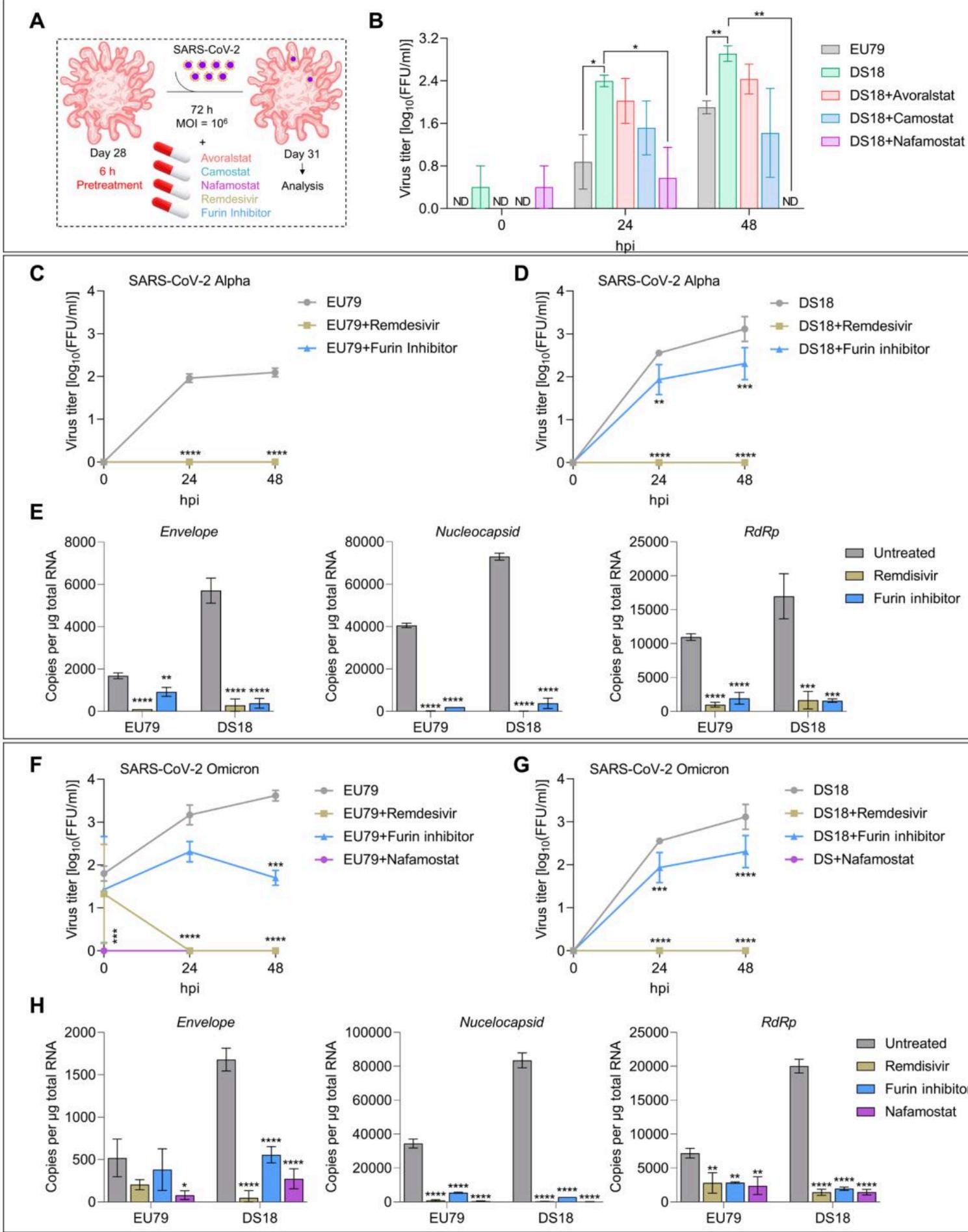 图 10. 针对 ChPCOs 中 TMPRSS2 活性的 FDA 批准抑制剂的药物筛选(A) SARS-CoV-2 感染流程示意图。感染期间在感染后立即加入瑞德西韦,持续 72 小时。(B) 经 100μM TMPRSS2 抑制剂处理的感染 ChPCO 上清液中病毒滴度的定量分析。数据以均值 ± 标准误表示。*P < 0.05,**P < 0.01,采用 Student’s t 检验。N = 20;类器官数量 = 60,汇总于表 S8。© 经 50μM 弗林蛋白酶(furin)抑制剂和 100μM 瑞德西韦处理的感染 ChPCO 上清液中病毒滴度的定量分析。数据以均值 ± 标准误表示。N = 3,汇总于表 S8。***P < 0.0001,采用双向方差分析。(D) 经 50μM 弗林蛋白酶抑制剂、50μM 瑞德西韦和 100μM 瑞德西韦处理的感染 ChPCO 上清液中病毒滴度的定量分析。数据以均值 ± 标准误表示。N = 3,汇总于表 S8。**P < 0.01,***P < 0.0001,****P < 0.0001,采用双向方差分析。(E) 第 31 天 ChPCO 中 SARS-CoV-2 包膜(Envelope)、核衣壳(nucleocapsid)和 RdRp 的表达情况图。数据以均值 ± 标准差表示。*P < 0.05,***P < 0.0001,采用单因素方差分析。N = 3,汇总于表 S8。(F) 经 50μM 弗林蛋白酶抑制剂、100μM 瑞德西韦和 100μM 萘莫司他(nafamostat)处理的感染 ChPCO 上清液中病毒滴度的定量分析。数据以均值 ± 标准误表示。N = 3,汇总于表 S8。**P < 0.0001,***P < 0.0001,采用双向方差分析。(G) 经 50μM 弗林蛋白酶抑制剂、100μM 瑞德西韦和 100μM 萘莫司他处理后,感染 SARS-CoV-2 奥密克戎 - 10⁶ FFUs 的 ChPCO 上清液中病毒滴度的定量分析。数据以均值 ± 标准误表示。N = 3,汇总于表 S8。***P < 0.0001,****P < 0.0001,采用双向方差分析。(H) 第 31 天 EU79 和 DS18 ChPCO 中感染 SARS-CoV-2 奥密克戎 - 10⁶ FFUs 后,奥密克戎病毒包膜、核衣壳和 RdRp 基因的表达情况图。数据以均值 ± 标准差表示。*P < 0.05,**P < 0.01,****P < 0.0001,采用单因素方差分析。N = 3,汇总于表 S8。