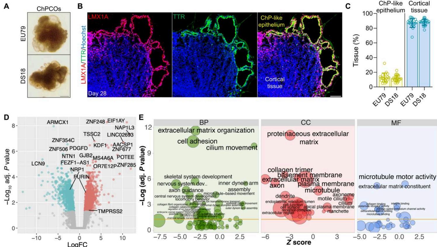 图 6. 模拟唐氏综合征(DS)的 ChPCO 转录谱分析(A) 第 28 天,整倍体和唐氏综合征诱导多能干细胞(DS-iPSC)来源的 ChPCOs 的代表性明场图像。比例尺,500μm。(B) 第 28 天整倍体 iPSC 来源的 ChPCOs 的代表性图像,用 LMX1A(红色)和 TTR(绿色)免疫染色。切片用 Hoechst 33342(蓝色)复染。比例尺,100μm。© 对至少三种不同的整倍体(EU79)和 DS(DS18)iPSC 来源的 ChPCOs 中脉络丛样上皮和皮层组织区室的定量分析。单个点代表一个类器官。实验总数 = 8;分析的类器官总数 = 29。每个时间点分析的类器官数量和实验次数汇总于表 S8。(D) 火山图突出显示第 28 天整倍体和 DS ChPCOs 中的差异表达基因(DEGs)。显著上调的基因以红色显示,下调的基因以青色显示。标记了最显著的 DEGs 以及 TMEM85、FURIN 和 NRP1 基因。(E) 与整倍体类器官相比,DS ChPCOs 中差异表达基因(DEGs)的基因本体(GO)富集分析。Z 值表示与每个条目相关的基因表达的累积增减。气泡大小与各 GO 条目相关的 DEGs 数量成正比。BP,生物学过程;CC,细胞组分;MF,分子功能。