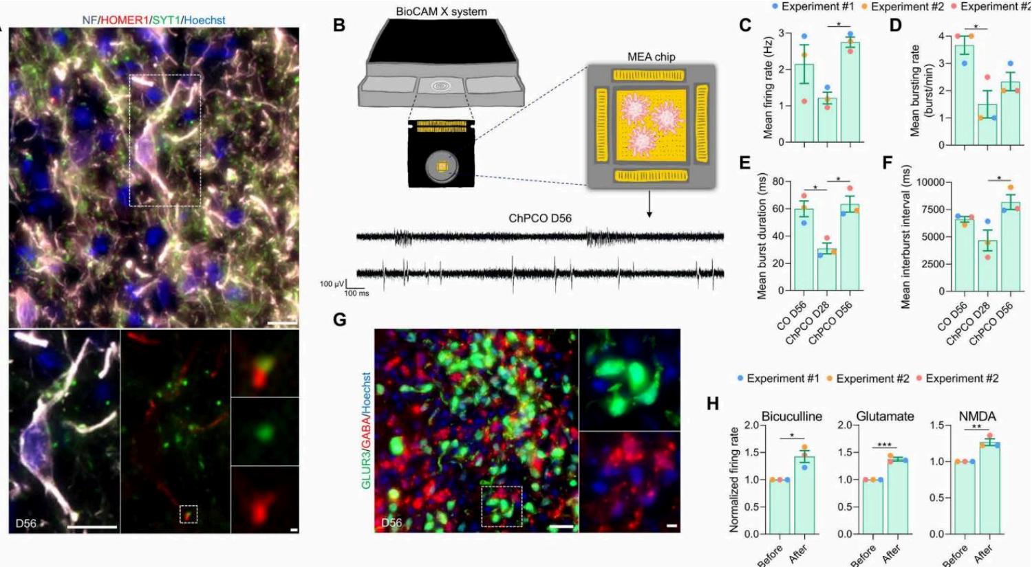 为了评估皮层神经元的功能特性,我们首先确认成熟神经元分别表达突触前标记物SYT1和突触后标记物HOMER1,且二者相邻分布(图5A),以此作为突触接触的形态学证据。随后,我们使用高密度多电极阵列(MEA)对关键电生理参数进行表征(图5B)。MEA分析检测到从第28天开始,ChIPCOs中出现自发电活动(第56天的轨迹示例见图5B)。随着时间推移,神经元自发放电率逐渐增加(图5C至F)。值得注意的是,在第56天放电率显著增加,此时在ChIPCOs中观察到GFAP⁺细胞(图4D)。然而,与CoGs相比,ChIPCOs在第56天的爆发率未显著增加(图5D)。我们推测这种差异可能是由于这两种类器官中存在的神经元亚型比例不同所致。我们注意到,56天的ChIPCOs包含谷氨酸能(GLUR3⁺)和γ-氨基丁酸能(GABA⁺)神经元,且二者彼此相邻(图5G),这与体内皮层发育过程中GABA能抑制性神经元的分化情况一致。用GABA受体激动剂巴氯芬(50μM)处理后,ChIPCOs的放电率显著增加(图5H和图S4E),证实存在抑制性突触传递;而急性谷氨酸(200μM)和N₆-甲基-d-天冬氨酸(NMDA)(50μM)处理则显著提高了放电率(图5H和图S4E),表明存在有活性的谷氨酸能和GABA能神经元。综上,这些数据表明,在第56天的ChIPCOs中,已很好地建立了具有兴奋性和抑制性神经环路的神经网络。
