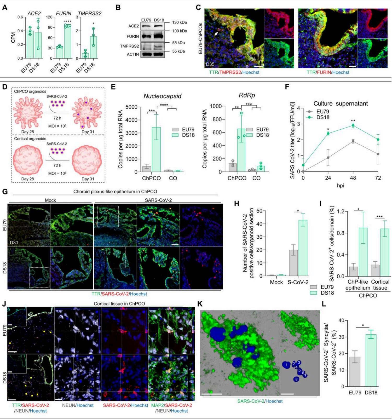 为何唐氏综合征(DS)患者更易感染SARS-CoV-2诱导的神经病理改变,其机制尚不明确。脉络丛(ChP)在屏障功能和免疫调节中起关键作用,同时表达ACE2受体和染色体21编码的TMPRSS2蛋白酶,这提示其在建立脑内SARS-CoV-2感染过程中具有重要作用。为探究该机制,我们利用DS患者及同基因二倍体iPSC构建了脑类器官(ChPCOs),该模型由功能性皮质神经元核心与功能性脉络丛样上皮外围构成。DS-ChPCOs重现了DS异常的皮质发育过程,并揭示脉络丛样上皮在纤毛发生和上皮细胞极性方面的缺陷。研究进一步证明,脉络丛样上皮会促进SARS-CoV-2在皮质神经元中的感染与复制,且该现象在DS模型中更为显著。抑制TMPRSS2和弗林蛋白酶活性可使DS-ChPCOs中的病毒复制降至二倍体水平。该模型为解析脉络丛在嗜神经病毒感染及二倍体前脑发育中的作用提供了平台,并为筛选治疗SARS-CoV-2诱导的神经病理改变的药物创造了条件。