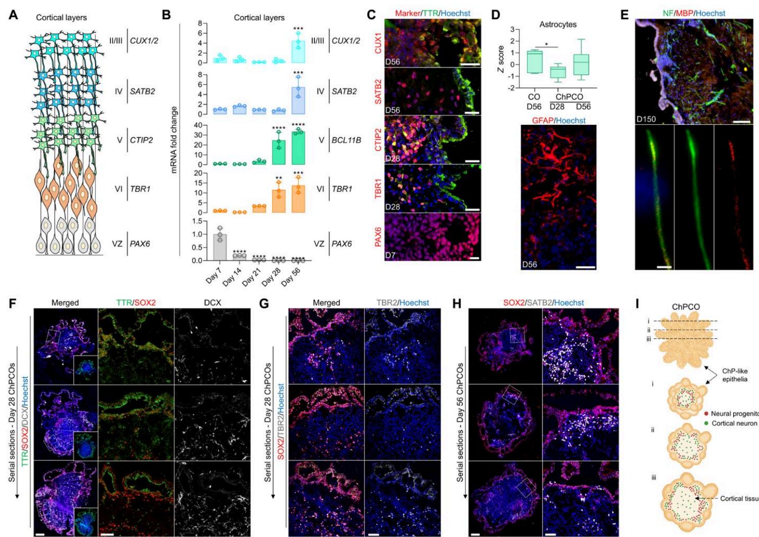 除上述脉络丛组分外,ChPCO类器官还具备其他神经区室。在胚胎发育过程中,NEct来源的头端神经管背侧形成端脑背内侧的脉络丛和皮质板(33)。我们通过检测已知在COs中表达的不同皮质神经元标志物,探究这些皮质板层的关键细胞区室是否与脉络丛样上皮细胞同步出现于类器官中(图4A)。发现PAX6 mRNA随时间推移逐渐减少(图4B)同时分别通过TBR1、CTIP2、SATB2和CUX1/2的表达检测到第VI、V、IV及II/III层神经元标志物相应增加(图4B)。对中线切面类器官进行这些神经元蛋白染色,结果显示在第28天即可观察到皮质 与 神经元的分化(图4C和图S4A),而 与 神经元直到类器官成熟第56天才被检测到(图4C)。皮质层特化发生在脉络丛样上皮细胞形成的脑室样结构邻近区域(图4C和图S4A)。在分化第56天的ChPCOs和COs中,也观察到胶质纤维酸性蛋白(GFAP)标记的星形胶质细胞特化(图4D),但第28天的ChPCOs中未见该现TBR1+象(图S4C),这与星形胶质细胞生成约始于第50天的观点相符(45)。此外,我们在第56天检测到PDGFRA和CNPase标记的少突胶质细胞(图S3D),并在第150天的成熟类CTIP2+ SATB2+ CUX1+器官中观察到髓鞘碱性蛋白(MBP)与神经丝蛋白共定位(图4E),提示髓鞘形成开始。为进一步解析ChPCO模型的空间结构,我们对第28天(图4F、G)和第56天(图4H)的ChPCOs连续切片进行SOX2、DCX、TBR2和SATB2染色,分别标记神经祖细胞、早期特化神经元祖细胞、深层中间神经祖细胞以及表层皮质神经元层。分别如图4 F至H所示。我们发现部分细胞更靠近脉络丛样组织表面,而其他细胞则位于内部且远离脉络丛样组织(图4 F至I)。同样地,在脉络丛类器官中,皮质神经元遍布SOX2+整个皮质组织(图4 G至I)。