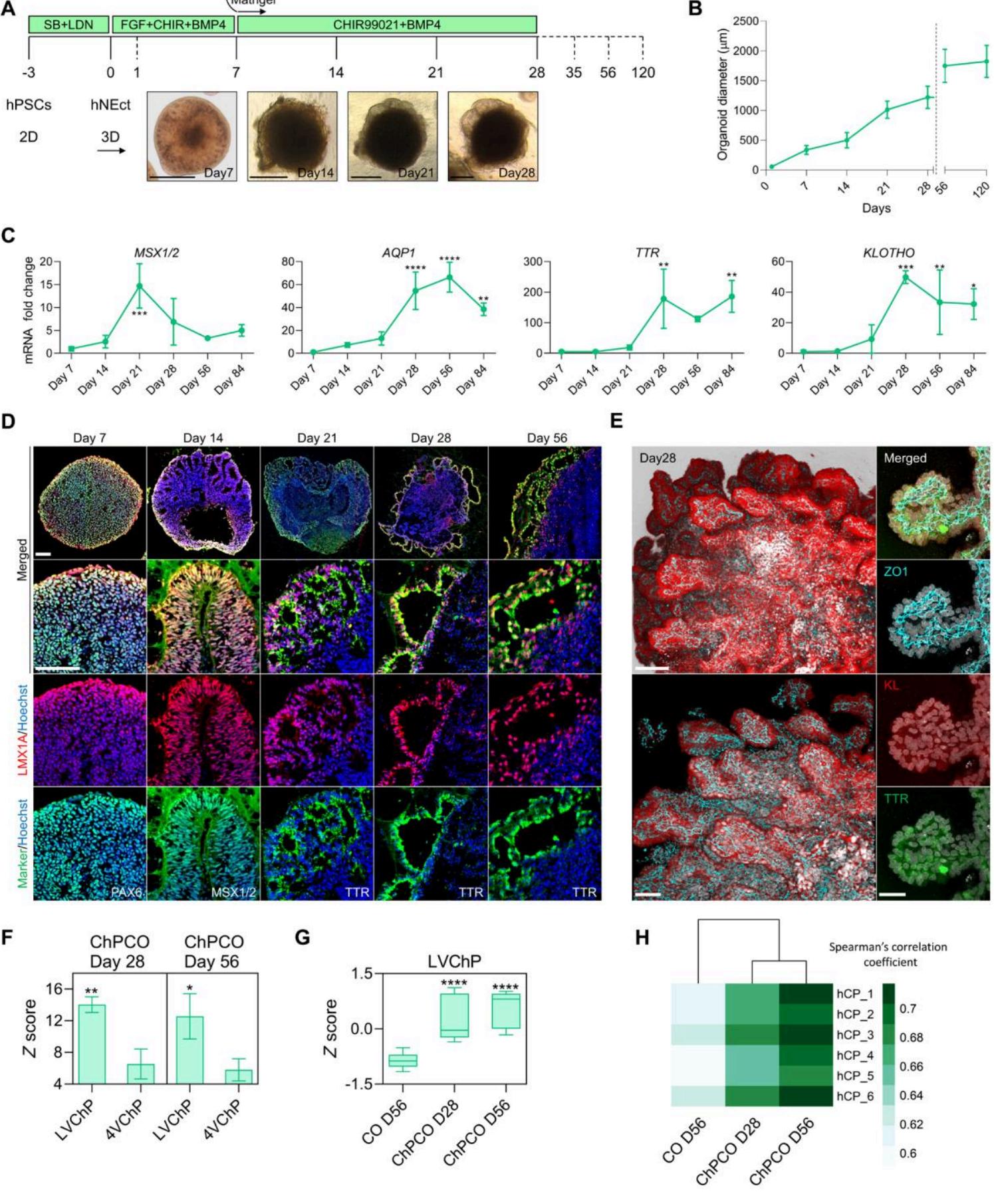 图1. 从神经外胚层生成人类自组织多ChPCOs的3D过程。(A) 从hPSCs生成ChPCOs的策略示意图。下方明场图像显示ChPCO在体外随时间的发展阶段。比例尺, 。(B) 显示体外生长 的图表。数据以均值 表示;总器官样结构 总结在表S8中。© MSX1/2、 、TTR和KLOTHO的qRT-PCR分析。数值归一化到GAPDH水平,并相对于第7天的值表达。数据为均值 ,通过单因素方差分析(ANOVA)。(D) 切片器官样结构的免疫染色显示PAX6(绿色)、LMX1A(红色)、MSX1/2(绿色)、LMX1A(红色)、TTR(绿色)和LMX1A(红色)的蛋白表达,并用Hoechst 33342(蓝色)复染。比例尺, 。(E) 分化第42天ChPCO的整体免疫染色。左侧图像显示多个ChPCO 500μ微米。ChPCO ±标准差 13 156 AQP 1 ±标准差; 4. ∗P < 0.05 ∗∗P < 0.01 ∗ ∗ ∗P < 0.001 ∗∗∗∗∗P < 0.0001 72μ微米