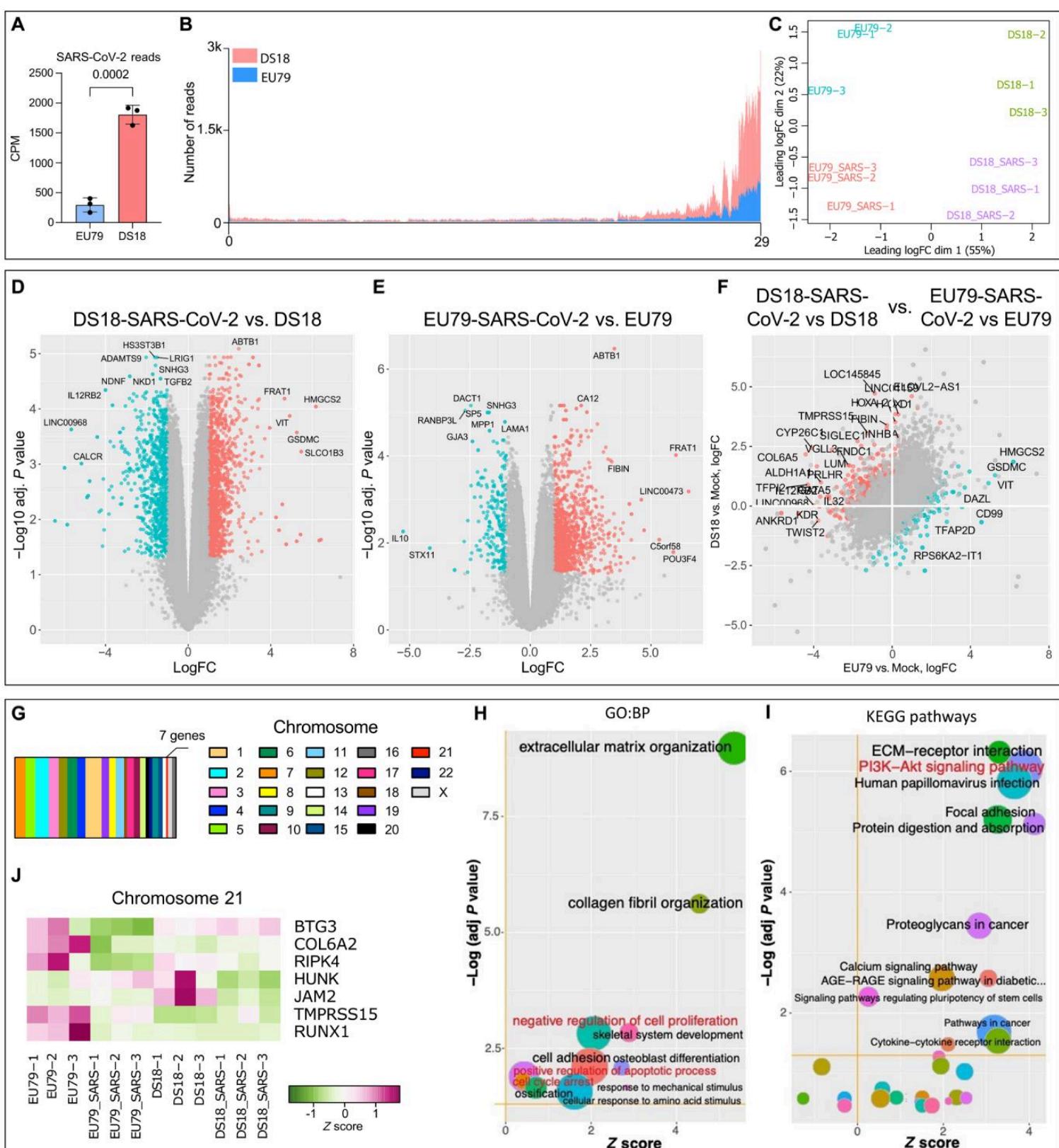 图9. SARS-CoV-2感染后整倍体与21三体脉络膜丛类器官的转录组分析。(A)整倍体(EU79)与唐氏综合征(DS18)ChPCOs中SARS-CoV-2来源的RNA-seq读数丰度。读数计数经文库大小标准化。误差线表示标准差。统计学分析采用Student t检验。(B)SARS-CoV-2来源的RNA-seq读数在病毒基因组上的分布。红色代表DS(DS18)ChPCOs,蓝色代表整倍体(EU79)ChPCOs。(C)未感染与SARS-CoV-2感染人ChPCOs(整倍体EU79与DS18)RNA-seq读数计数的多维尺度分析。(D-E)火山图分别突出显示SARS-CoV-2感染DS(D)与整倍体(E)ChPCOs相较模拟感染的差异表达基因。(F)散点图展示DS18与EU79 ChPCOs在SARS-CoV-2诱导基因表达变化中的差异。图(D)至(F)中,经FDR校正且表达水平至少发生两倍变化的显著上调/下调基因分别用红色和青色标示,多数差异表达基因已标注。(G)基于(F)识别的SARS-CoV-2响应差异表达基因在各染色体上的分布。(H)GO富集分析与(I)KEGG通路富集分析(基于F中差异表达基因)。Z值反映各条目关联基因表达的整体上调或下调程度。气泡大小与对应GO条目关联的P < 0.05差异表达基因数量成正比。(J)(F)中鉴定的21号染色体相关基因在SARS-CoV-2感染/未感染DS18及整倍体(EU79)ChPCOs中的表达情况。