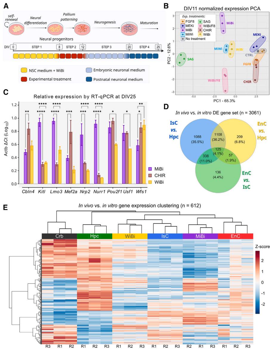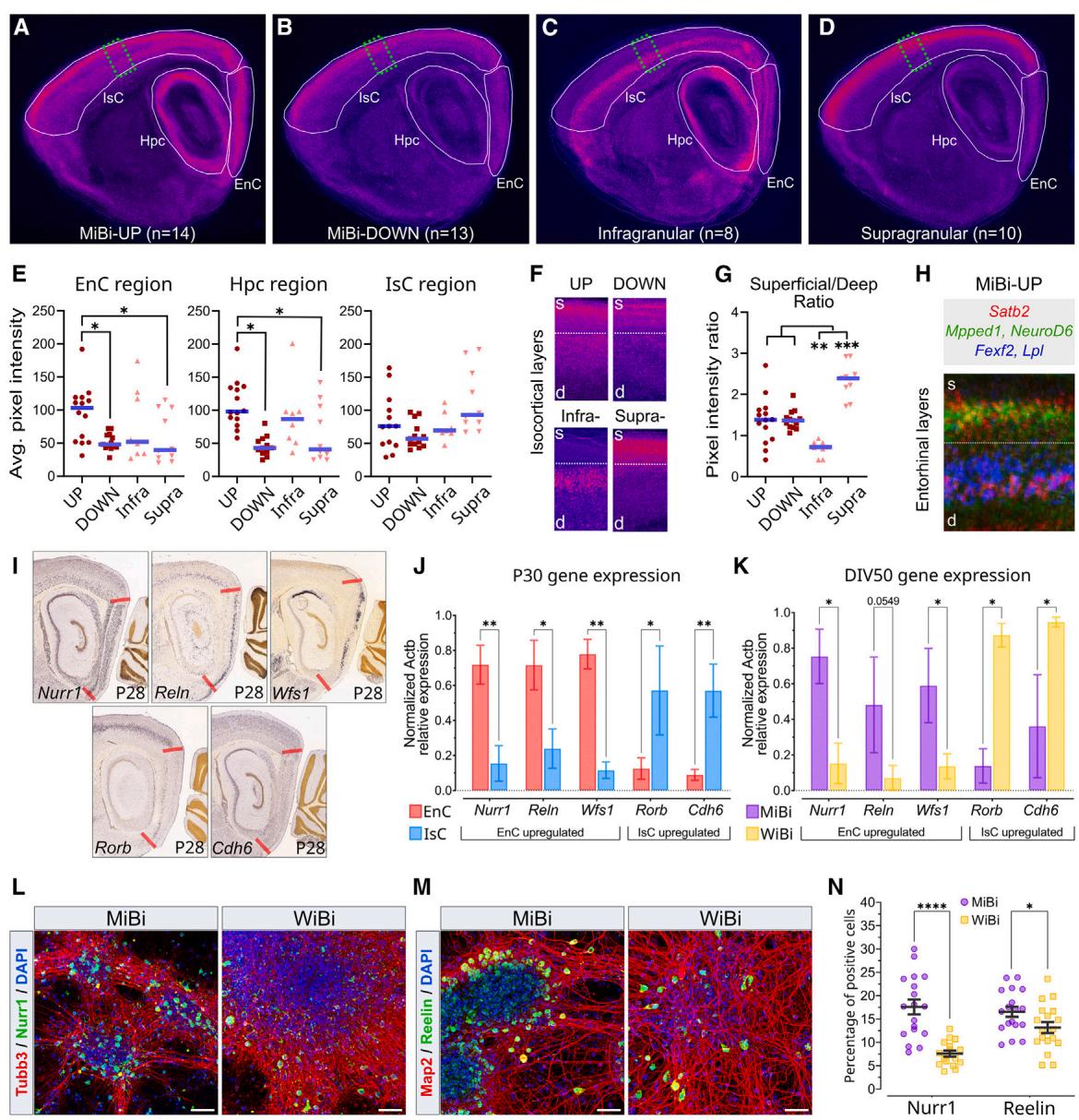 为了更好地研究MiBi培养物的皮层身份,我们比较了DIV25 WiBi和MiBi细胞与来自出生后第5天(P5)小鼠的IsC、海马(Hpc)、小脑和EnC,一个发育上可比的时间点如建议根据先前观察结果(Gaspard等人,2008)的建议,P5 EnC和IsC表现出最低程度的全局基因表达差异(n= 656个差异表达[DE]基因,占总基因数的4.4%),其次是EnC与Hpc的比较(n= 1,499个DE基因,占总基因数的10.1%,图S1B)。正如最近一项研究(Franjic等人,2020)所指出的,这些发现可能源于EnC和IsC层状结构的相似性——EnC层中充分体现了深层层状皮质兴奋性神经元,以及海马亚区域内观察到的显著异质性。我们选择了三个皮质区域(IsC、Hpc和EnC,n= 3061)中的DE基因,以降低转录组数据的复杂性,并分析主成分分析(PCA)中体现体外和体内样本位置细胞身份的成分(图1D和S1C-S1E;参见方法)。第一和第二主成分(PC1和2)区分了体内和体外样本(图S1F),而占总方差36.1%的第二和第三成分(PC2和3)则区分了不同培养条件和脑区域的表达谱(图S1G)。对构成PC2和3大部分方差的基因进行层次聚类(参见方法)揭示了3个基因簇的存在(图S1H),这些基因簇参与调控不同的生物过程(图S1I)。该基因集突出了MiBi与EnC样本之间的显著相似性,而这两者与WiBi和IsC存在差异(图1E)。综上所述,这些观察结果表明MiBi细胞具有与EnC相似的皮质身份。
