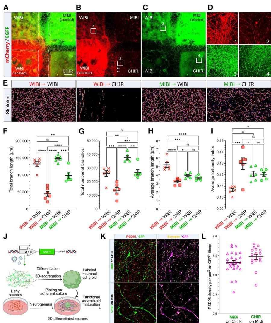 为了比较MiBi和WiBi神经元的连接性,我们测试了它们产生长程投射和形成异型连接的能力。为此,我们开发了一种体外连接性实验,其中使用十字形4孔培养插件(见方法部分)将贴壁培养物接种在玻璃底培养皿上,间距500微米,并测量了病毒标记的MiBi和WiBi神经元向周围未标记的WiBi或CHIR培养物发出突触的能力(图4A–4E和S5)。共培养10天后,携带mCherry标签的WiBi细胞突触有效跨越500微米间隙,抵达未标记的WiBi与CHIR培养物(图4B插图D1和D2)。但多数抵达CHIR细胞的WiBi突触易发生弯曲,未能与培养体系建立深层连接(图4B插图D2箭头所示),这与侵入同型培养物的突触形成鲜明对比(图4B插图D1)。相反,带有EGFP标签的MiBi细胞突触能以相当效率成功侵入未标记的WiBi与CHIR培养物(图4C插图D3和D4)。我们分别量化了在CHIR和WiBi未标记培养体系中,由病毒标记的WiBi或MiBi细胞产生的纤维分支总数、长度、平均分支数量及弯曲度(图4E–4I、S5B和S5C)。该分析在未标记培养物的特定区域进行,这些区域与标记培养物相对,且远离所有培养物纤维汇集的中心区(图S5A–S5C;见方法)。WiBi培养体系中WiBi与MiBi神经元的总分支长度相当,而CHIR培养体系内WiBi神经元的总分支长度则显著缩短。
