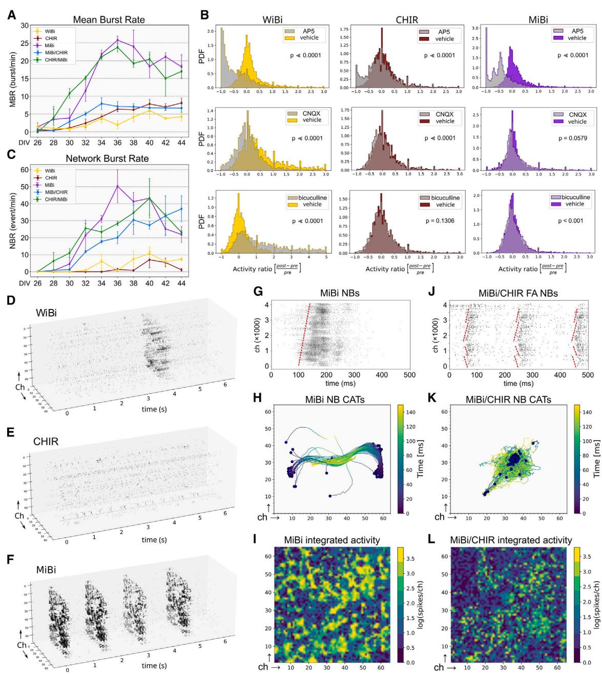 © 所有培养体系中NBR的时间趋势(均值 标准误)。(A)、(B)和©中数据代表2次独立实验。(D–F) 纯培养条件下短时间窗口的三维光栅图重建,保留通道空间位置。(G和J) MiBi与MiBi/CHIR FA的代表性二维光栅图,显示NB在芯片上传播的时间延迟(红色虚线标注)。