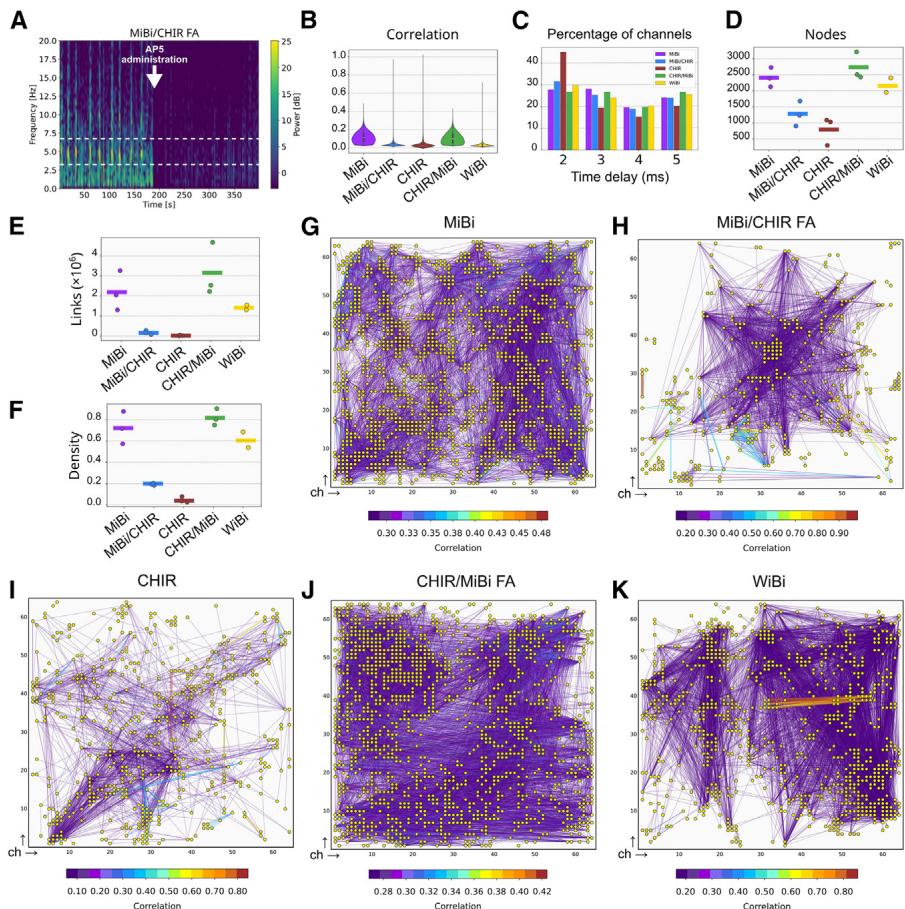 为评估信号传播的动态特性,我们对每个神经爆发进行了CAT分析,以确定同步事件的起始点(参见方法部分)。各神经爆发的起始点出现在MiBi与WiBi培养网络的不同区域,CAT在150毫秒内向网络中心移动(图5H、5I和S6N)。事实上,相邻通道间的爆发起始时间似乎以时间增量形式分离神经元培养物。每个黄点代表一个活跃通道(仅显示相关性最高的0.5%节点);彩色线条表示两点之间的相关性强度。颜色条表示相关性指数。