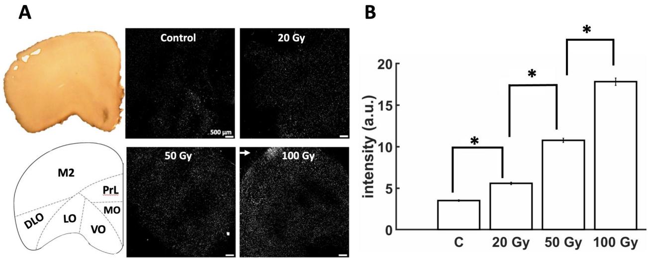 图6. 辐射后前额叶切片的碘化丙啶(PI)染色结果。(A)代表性样本显示PI强度随辐射剂量呈梯度增加。箭头指示100Gy处的PI强度聚集现象。左侧面板显示次级运动皮层(M2)、前边缘皮层(PrL)、内侧眶皮层(MO)、腹侧眶皮层(VO)、外侧眶皮层(LO)和背外侧眶皮层(DLO)的大致位置。(B)PI平均强度(“a.u.”:任意单位)。