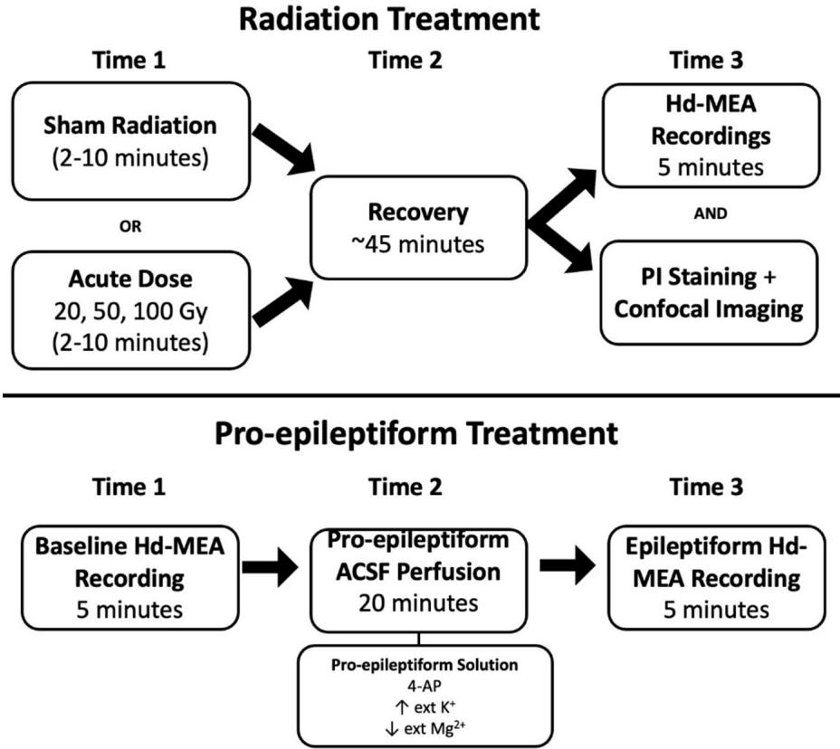 高清微电极阵列记录的一个局限是,在操作上无法实施典型放射治疗方案中使用的分次剂量照射。尽管现有可植入式在体阵列,但该平台对放射线的高度敏感性引发重大关切。此外,在体实验过程中使用的麻醉剂已知会影响大脑活动并改变神经元功能,这可能对记录数据造成干扰。我们选择采用大剂量单次放射方案,例如立体定向放射外科、脉冲高剂量率近距离放疗以及某些大分割姑息治疗方案所使用的剂量。这些剂量同时为比较标准剂量率(5-10戈瑞/分钟)与超快剂量率(40戈瑞/秒)对神经活动各项标志物及细胞死亡的影响提供了基准参照。