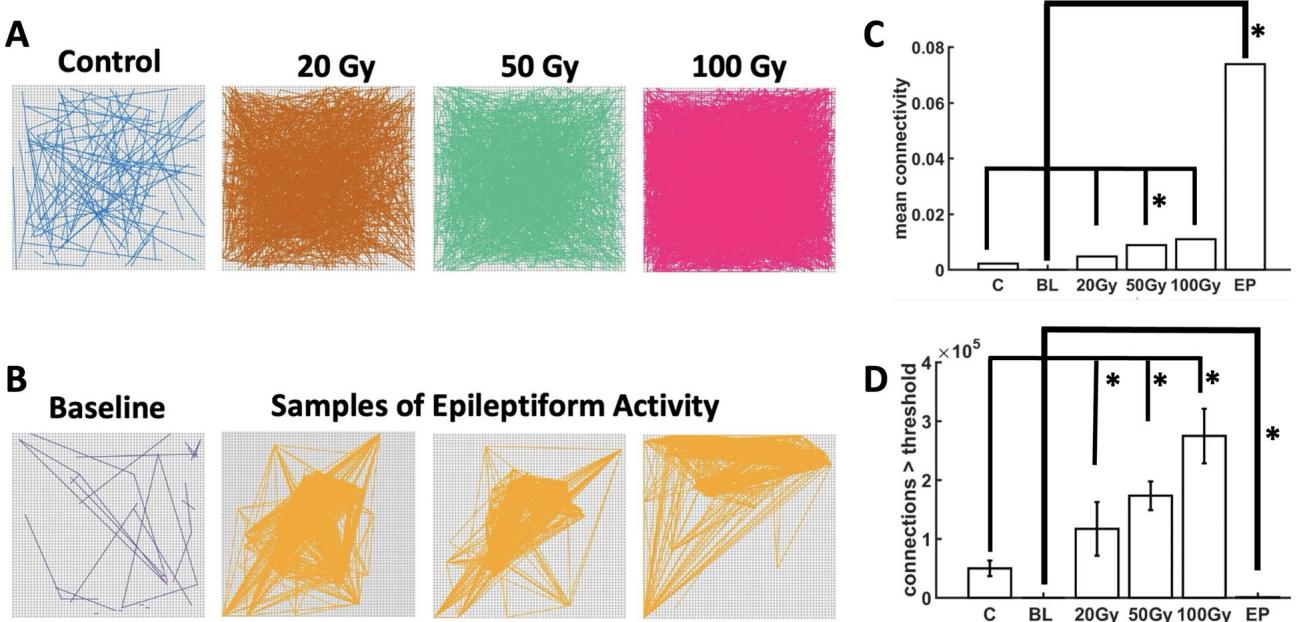 这些结果与癫痫样活动存在明显区别:后者的复杂度显著更高,且功能连接虽强,但由于癫痫发作空间聚焦范围有限,其连接密度低于辐射切片。辐射切片与癫痫样活动之间的差异凸显了两种条件下获得效应的明显区别:虽然辐射切片和PE切片中的神经元活动与复杂度均有所提升,但辐射条件下的功能连接分布范围较PE处理更为广泛。本研究提出了一种新型检测方法,用于测试临床相关剂量辐射15, 16对神经动力学及细胞凋亡的影响。