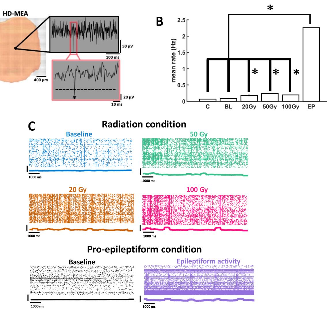 对照切片接受假照射后,经过45分钟的恢复期再进行记录或成像步骤。综上,该平台可直接比较癫痫样活动与辐射诱导的神经活动变化,并能评估剂量依赖性细胞凋亡。