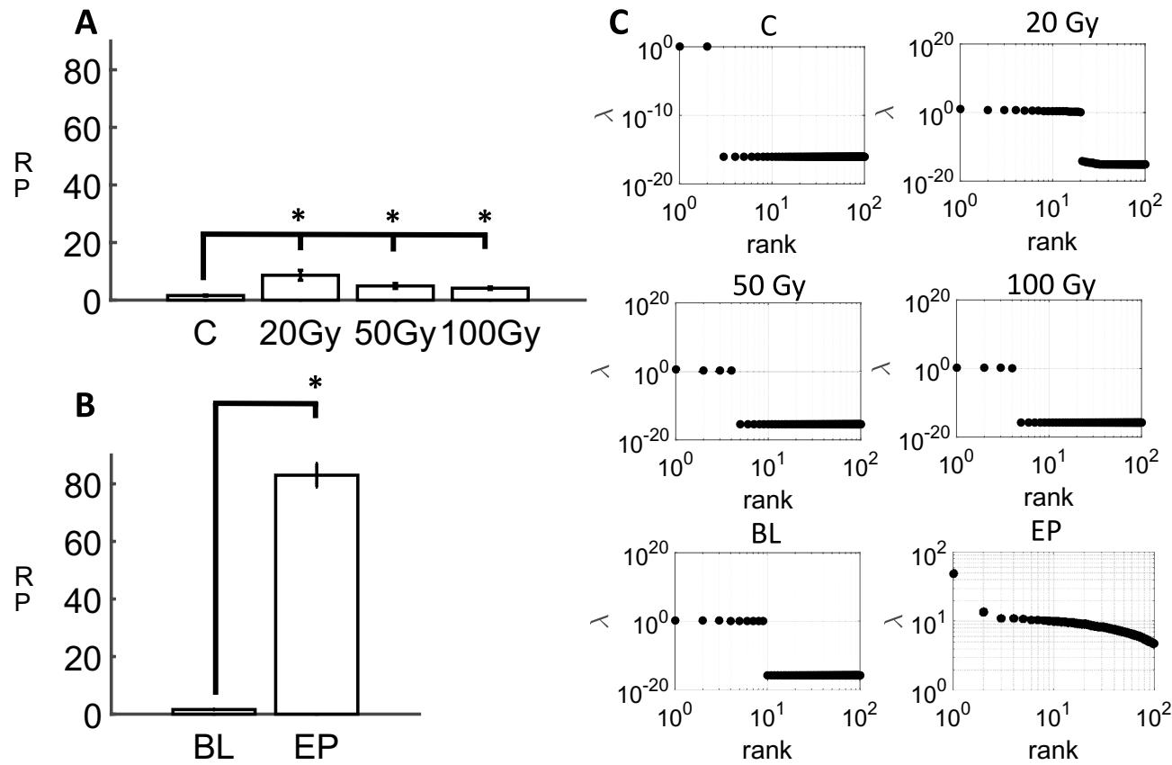 在辐射和PE切片中检查了群体活动的复杂性,这指示了捕获神经元数据所需因子的数量23, 24, 25, 26。在所有递送到PFC的辐射剂量下,辐射切片的复杂性均高于对照组(图 5A)。对于20 Gy( p˙=1.0116e−15 )、50 Gy( pˇ=3.316e−20, )和100 Gy(p1.0041e−17),复杂性显著高于对照组。因此,辐射可靠地增加了在hd-MEA上记录的神经数据的复杂性。