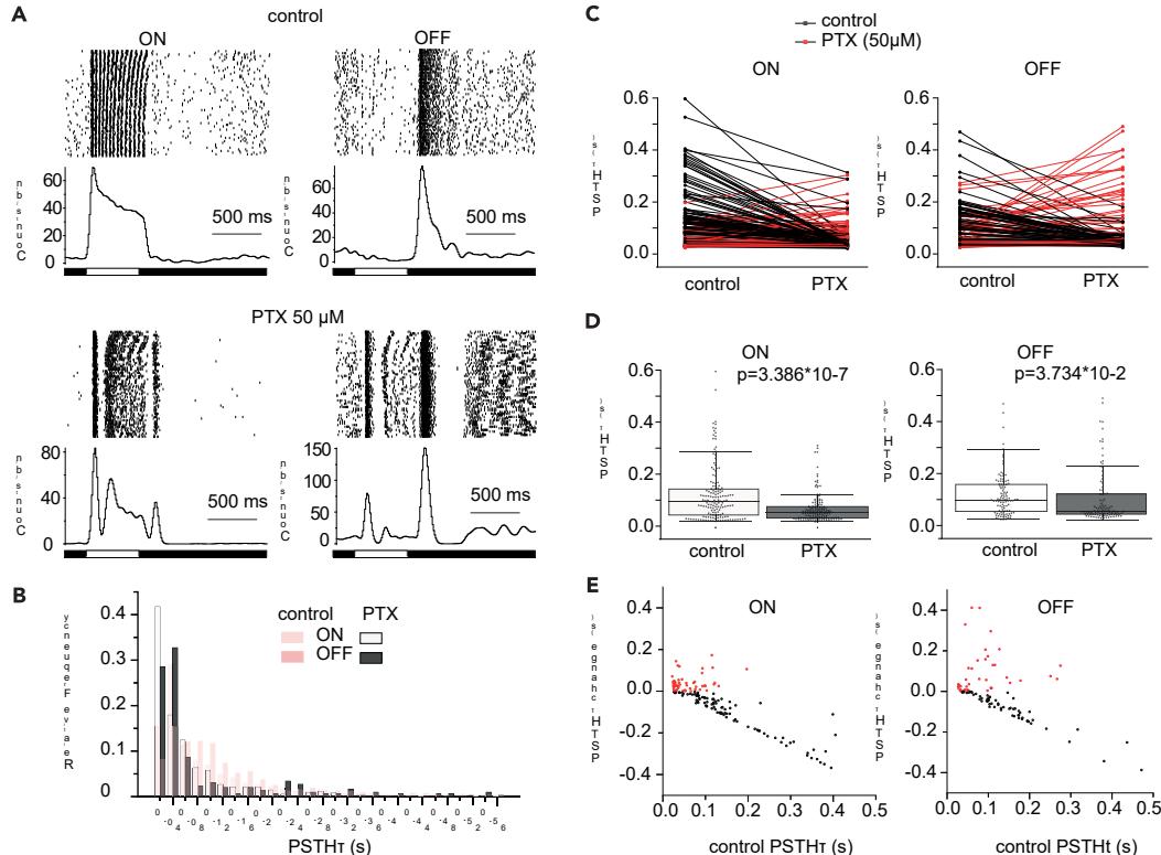 (A)当应用非特异性GABA受体阻断剂PTX后,代表性ON型(左)与OFF型(右)RGC光反应(上方为栅格图,下方为对应的PSTH)发生明显改变(同组RGC底部面板)。观察到的变化包括:OFF细胞持续反应成分(肩状区)的消失,以及ON细胞中OFF通路驱动的放电成分与OFF细胞中ON通路驱动的放电成分的显现(与既往报道一致)27,28,36。