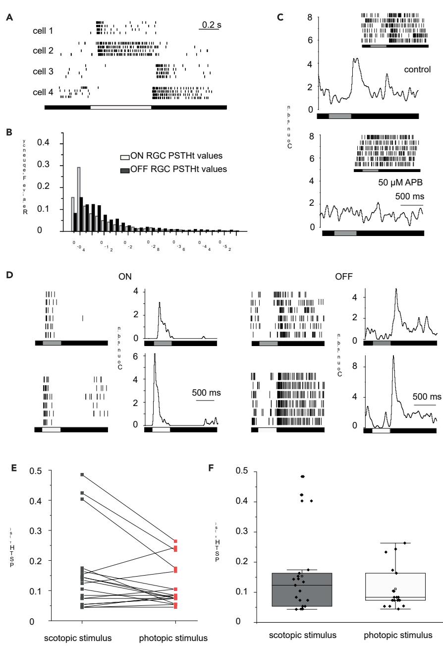 (F)浮动条形图显示在暗视(灰色)和明视(白色)条件下,RGC反应PSTHt值具有相似的变异性。图中所示为平均值(线)、 和 四分位数(箱体)及标准差(须线)。