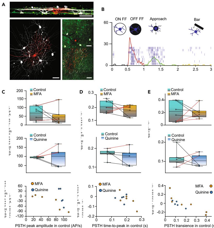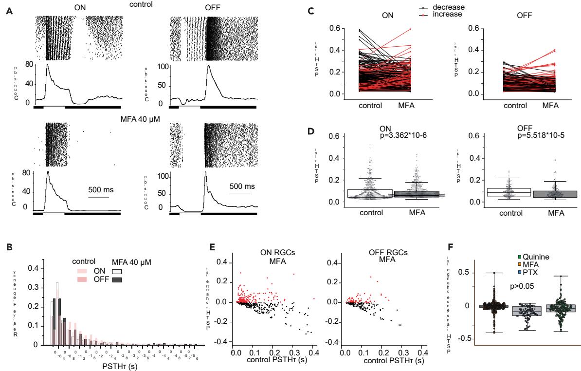 (D) 耦合tOFFa视网膜神经节细胞的响应延迟(峰值时间)在MFA(上图)或奎宁介导的间隙连接阻断后呈现异质性变化 e(底部)我们发现两种药物都引起了瞬时的变化,这些变化在细胞间差异很大(减少: ,增加: 和 保持不变) D基本保持恒定: 。