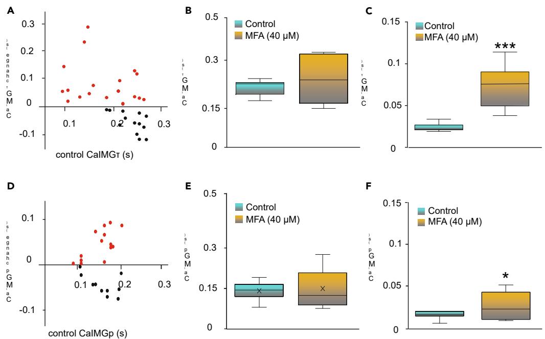 图7. 信号动力学通过RGC间隙连接实现均衡化�(A和D)散点图显示来自 个tOFFa阵列的汇总数据。多数视网膜神经节细胞的延迟(A)和瞬态值(D)呈现异质性变化趋势,表现为上升或下降。(B-F)箱形图分别展示对照组(绿色)与MFA处理组(黄色)在响应瞬态(B,C)和延迟(E,F)指标上的平均值(B,E)及标准差(C,F)。尽管间隙连接阻断未引起平均延迟与瞬态值的显著改变,但MFA处理后其数值范围与标准差显著增大(瞬态指标: ,Wilcoxon符号秩检验,图C;延迟指标: ,Wilcoxon符号秩检验,图F)。图示包含均值(中线)、 与 四分位数(箱体)及标准差(须线)。