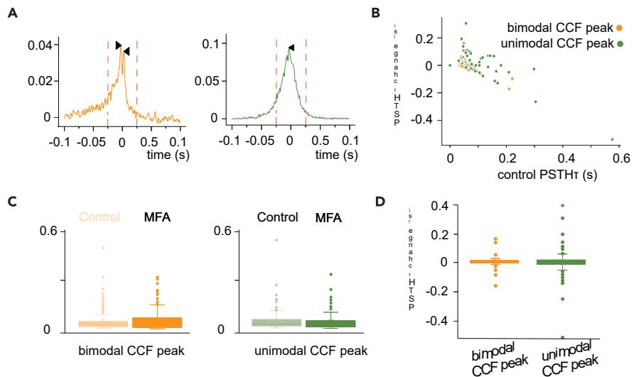 箱线图总结了药理性间隙连接阻断对具有双峰CCF峰(左)和窄单峰峰的视网膜神经节细胞群体的影响(操纵注意,图中显示的是绝对值,以便聚焦于变化的幅度。显然,异质性MFA诱导的视网膜神经节细胞反应瞬态变化结果导致平均数据几乎没有改变。