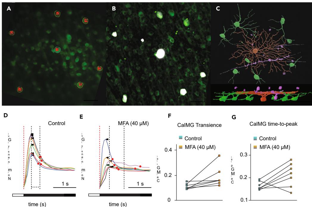 然而,GJ阻断对tOFFa反应瞬态性的异质效应最初令人惊讶,因为我们预期相同亚型的RGC在统一条件下会表现相似。为深入探究,我们决定记录形成同一GJ耦合阵列的tOFFa细胞邻近单元的反应,基于GJ对直接相互连接的tOFFa细胞反应瞬态性应产生相似影响的假设。为此,我们选择 成像技术,该技术能通过形态学识别被记录的tOFFa细胞及其GJ耦合邻细胞。我们在Thy1-GCamP3小鼠( )中进行了 成像测试,根据胞体大小和形状靶向定位tOFFa RGC(图6A)。同时将 成像测试与细胞内Neurobiotin示踪剂注射及后续组织学分析相结合。示踪剂注射使得后续识别和检测示踪剂耦合RGC的 瞬变成为可能。与前期实验类似,我们以树突形态及其与α-HCN4标记双极细胞轴突末端的共分层特征作为tOFFa细胞识别的指导依据(图6B)。除形态特征外,注射细胞与耦合tOFFa RGC的光诱导 瞬变均显示OFF极性反应,进一步支持tOFFa身份的判定(图6C、6D)。在这些实验中,我们分别在对照条件和MFA( )孵育后检测了已识别tOFFaRGC与Neurobiotin耦合RGC邻细胞的光诱导 瞬变。发现形成GJ耦合阵列的tOFFa RGC在对照条件下光反应动力学较为均一,但动力学参数(延迟、瞬态性、振幅)均因GJ阻断发生明显改变(图6D、6E)。但有趣的是,这种改变仍呈现异质性特征——即使在同一GJ网络内,不同细胞对阻断的反应程度也存在差异。