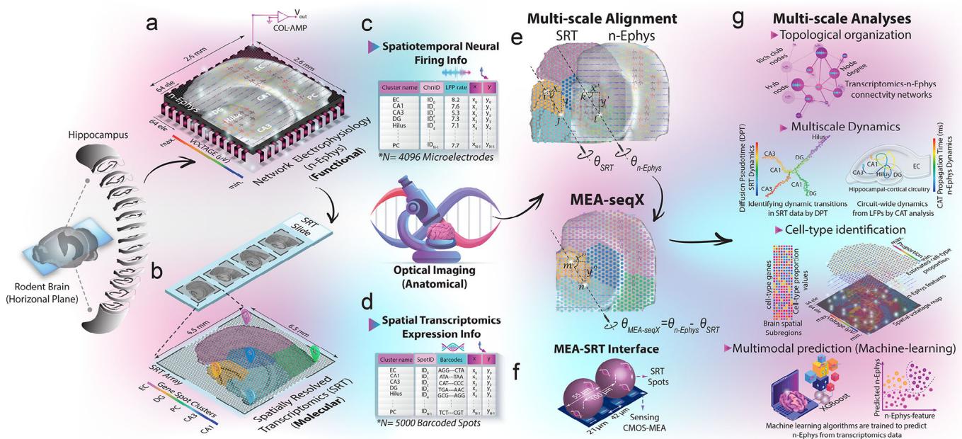 图1. MEA-seqX平台整合跨尺度脑动力学概览。a,b) 该平台结合高密度CMOS微电极阵列、光学显微镜与空间测序技术,旨在解析空间转录组与神经振荡动力学之间的关联。c) 配备4096个传感电极的高密度CMOS微电极阵列能以亚毫米级空间精度,精准捕获源自海马体各区域的功能性放电LFP模式。d) 基于空间条形码技术的SRT平台包含5000个检测点,可实现基因表达谱的系统性空间映射,揭示海马体各区域的转录组空间异质性。e) 采用Python开发的数据处理流程通过多层面空间重标定与配准方法,构建神经活动与转录组特征间的直接关联。f) 以单个传感电极与SRT检测点为例的局部特写,凸显了两类平台在物理尺度上的显著差异。g) 基于多维读数的高级分析可揭示多尺度网络特征:拓扑图分析捕捉多模态转录-功能连接网络,基因伪时序与活动轨迹中心量化多尺度神经动力学,空间转录组数据推断的细胞类型组成与其在电生理记录中获取的放电特征相关联,自动化机器学习算法能根据转录组谱精准预测电生理特征。